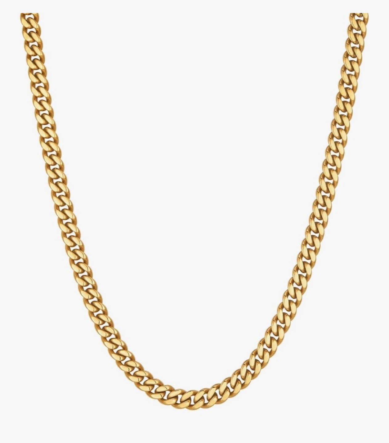 This is a classic gold Cuban link chain necklace. It's a stylish accessory for any outfit. Gold-toned metal.
