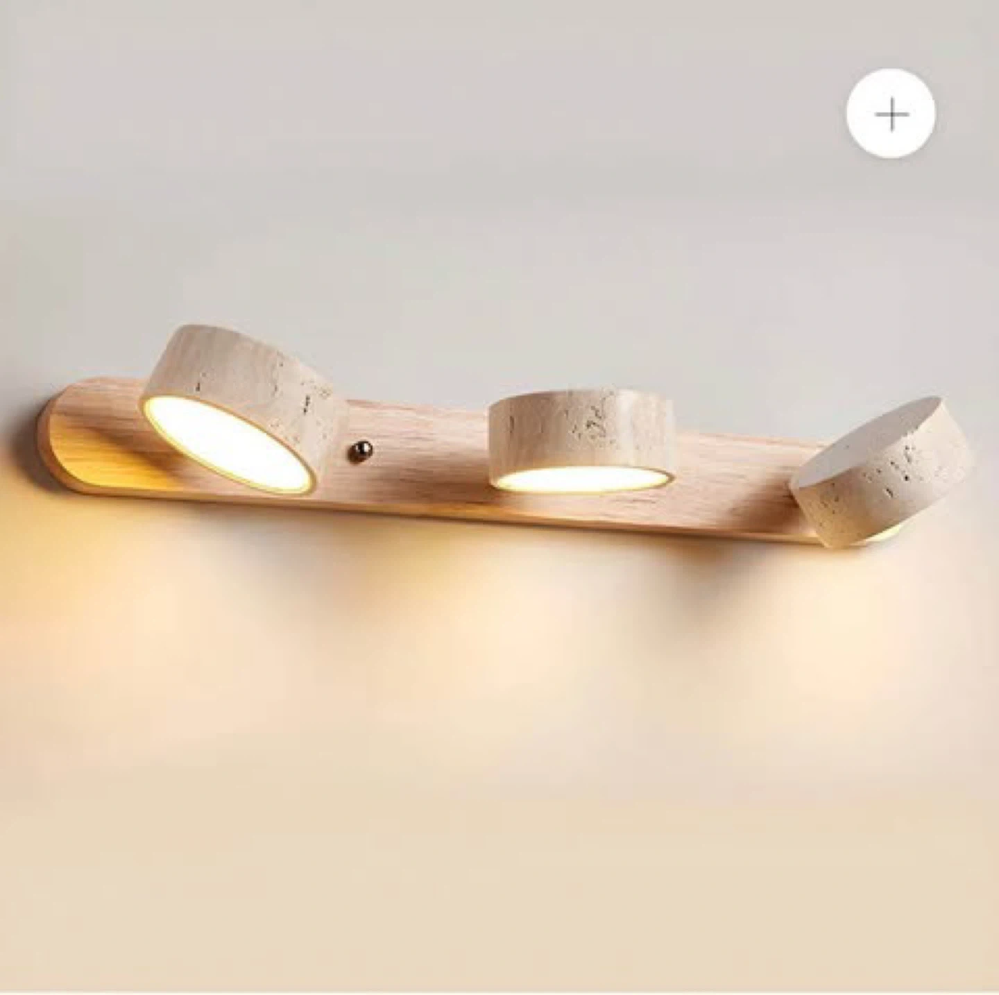 A modern wall light featuring a natural wood base and three adjustable lamp heads. The lamp heads can rotate 180 degrees, allowing you to direct the light where you need it most. This fixture uses a clean, contemporary design suitable for various room aesthetics.