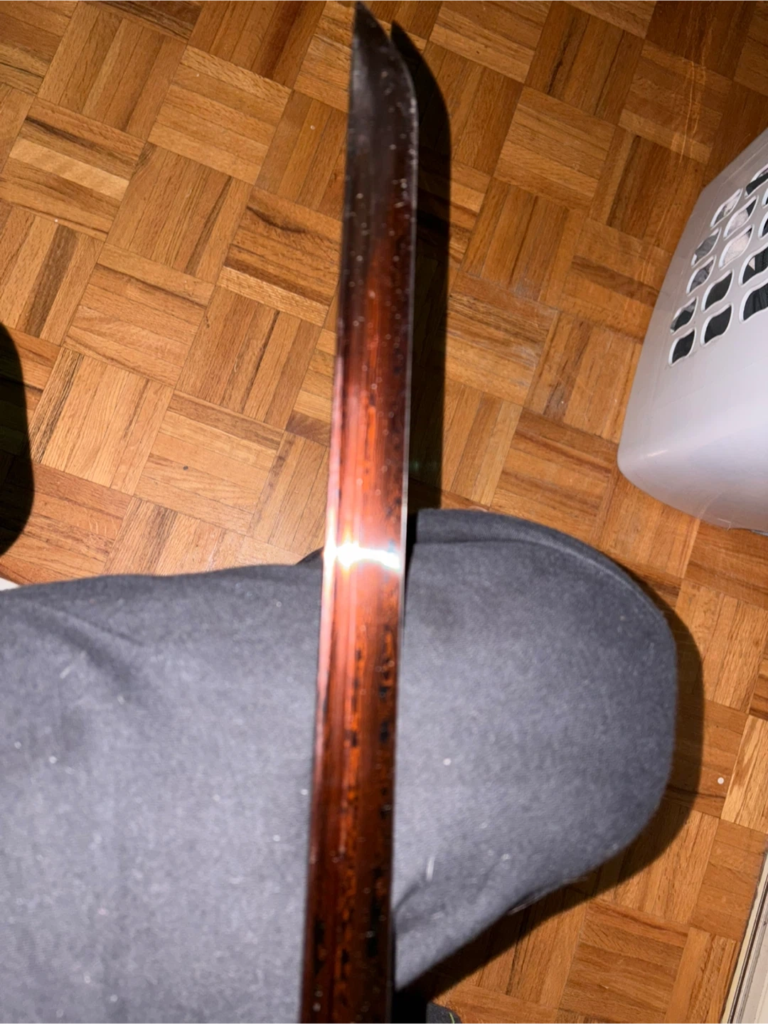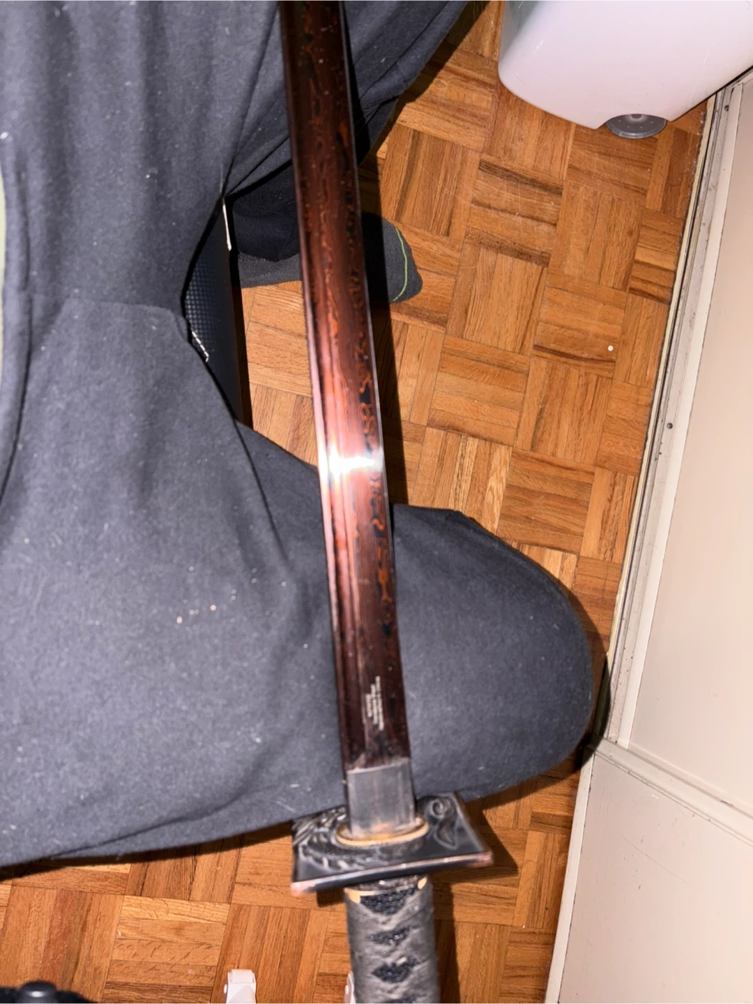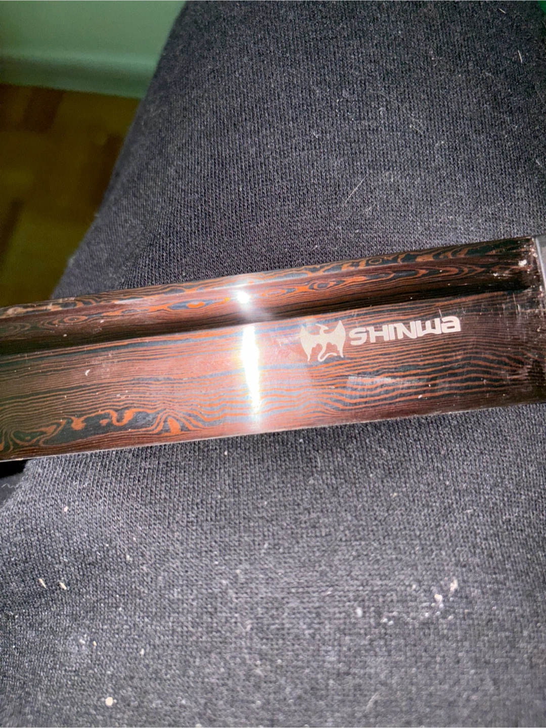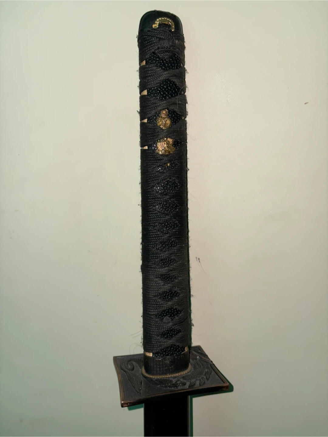 Shinwa Black Knight Ninja Sword, Damascus Steel, Ray skin, hardwood sheath handcrafted in China. It's made with Damascus steel and features an intricately designed dragon on the guard. The handle is wrapped for a secure grip. 1024 layers of Damascus steel.