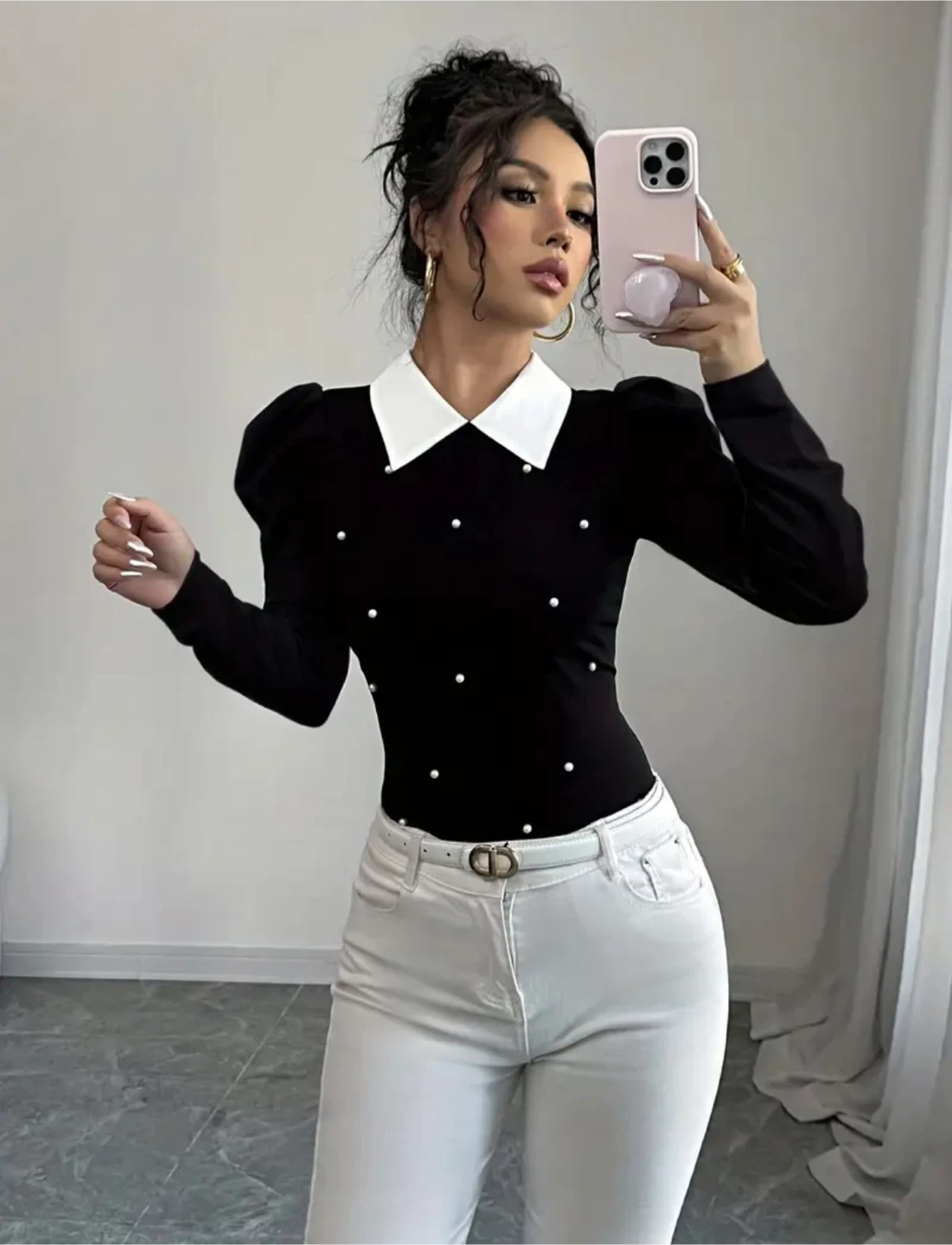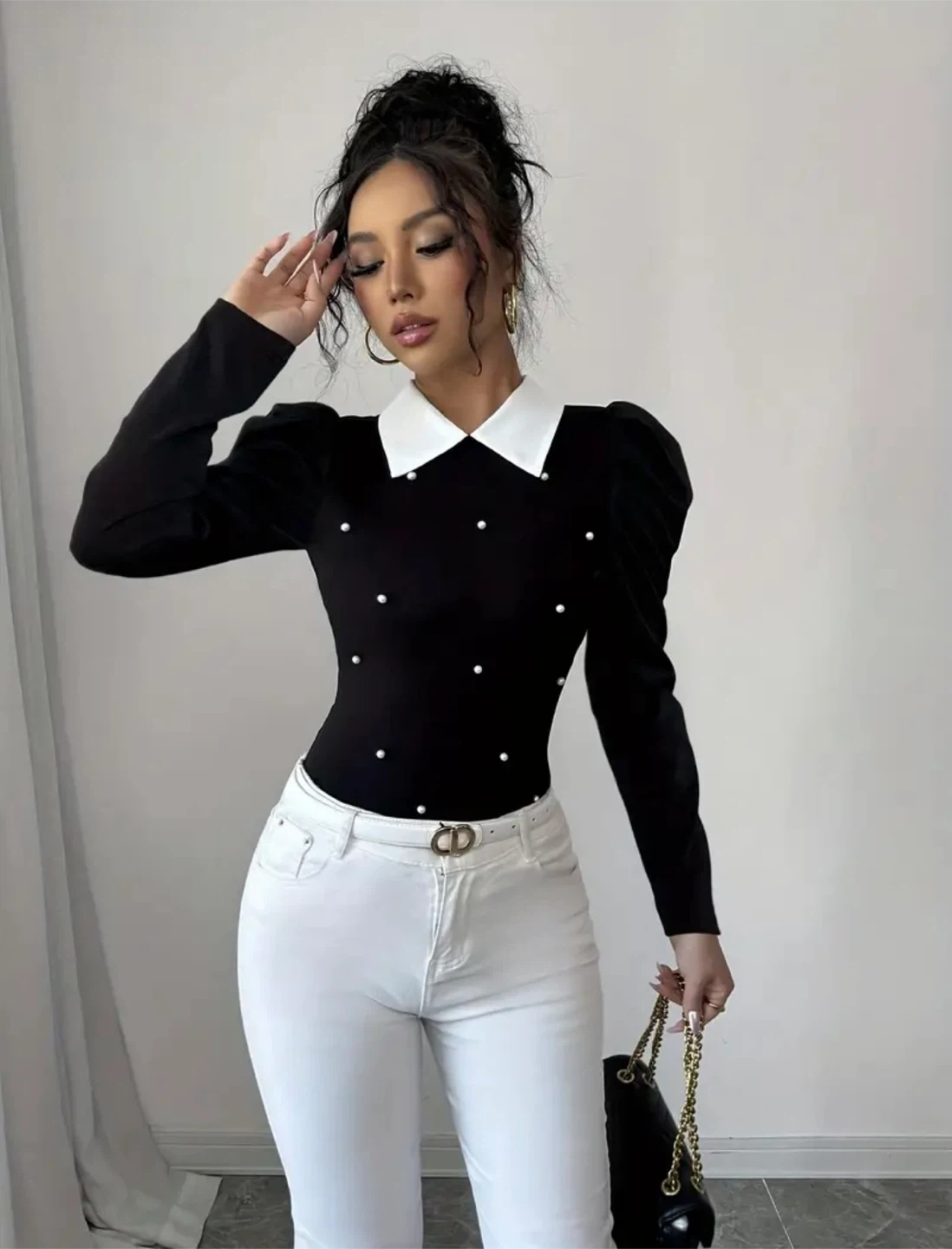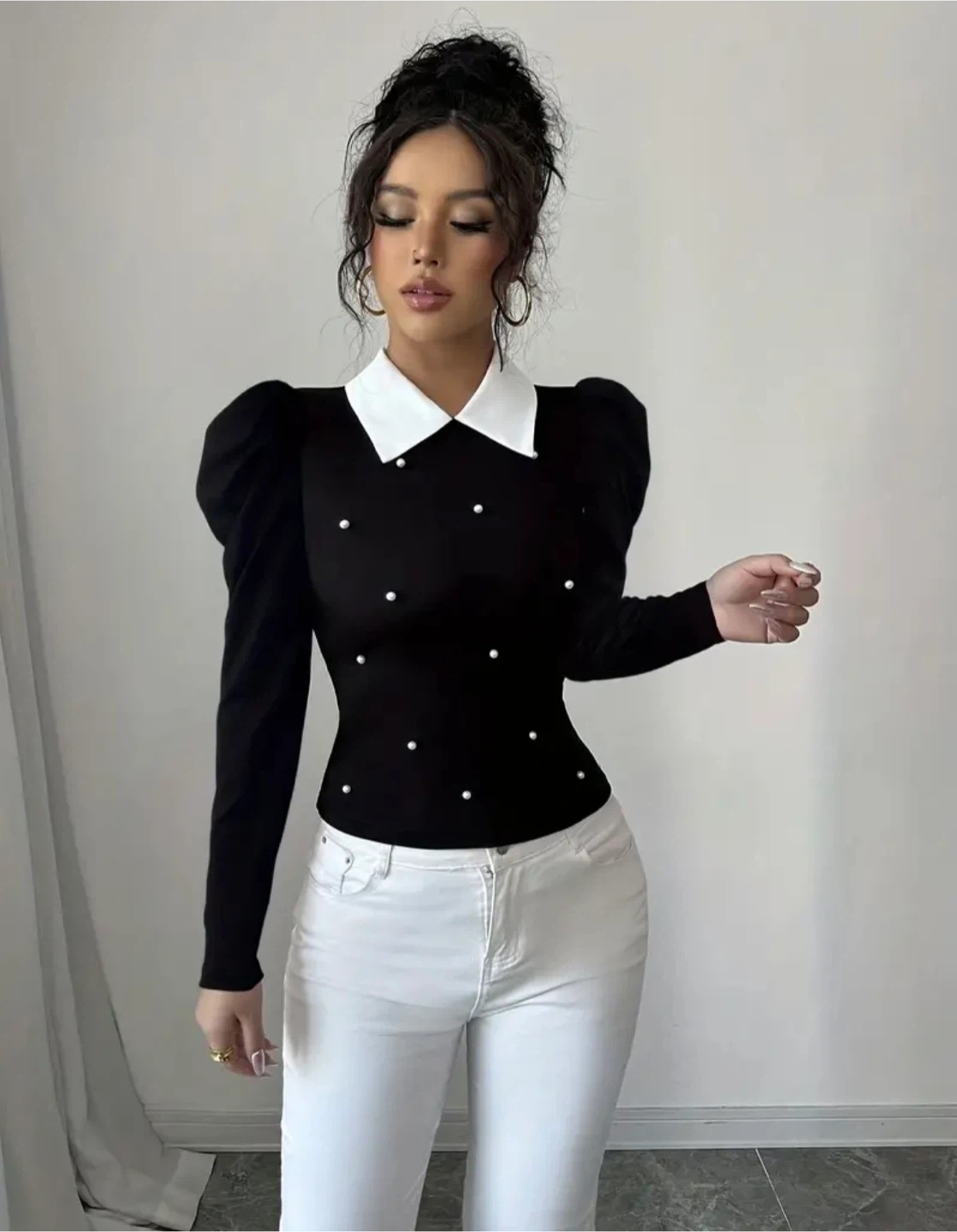 New Black Puff Sleeve Top with White Collar & Pearl Details