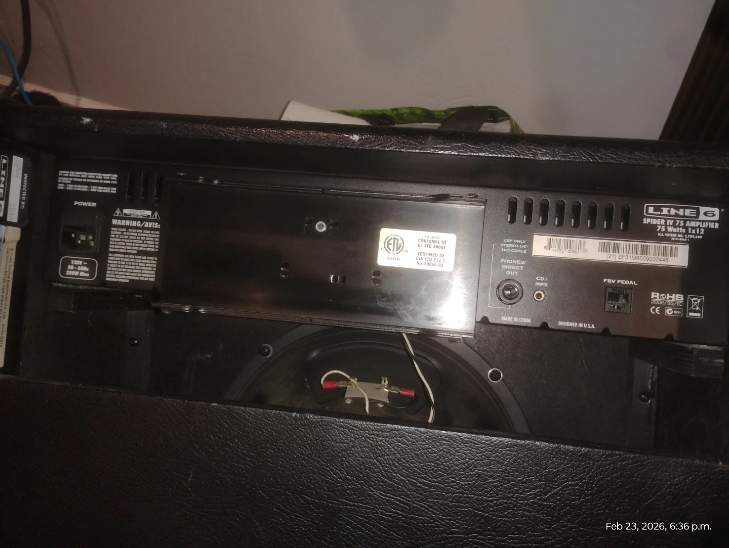 This is a Line 6 Spider IV 75 guitar amp. It's a 75-watt amplifier with a 1x12 speaker. It features multiple amp models and effects. It's suitable for practice or small gigs.