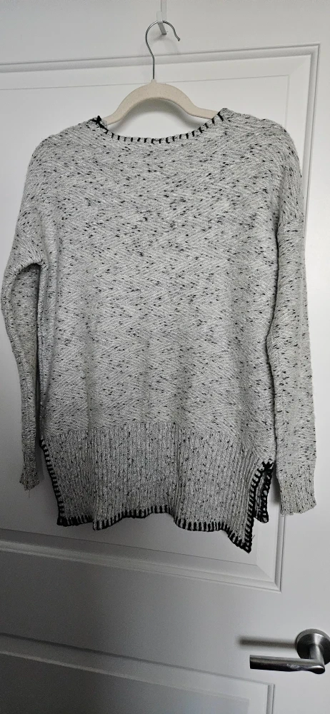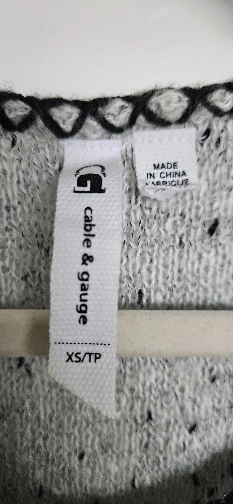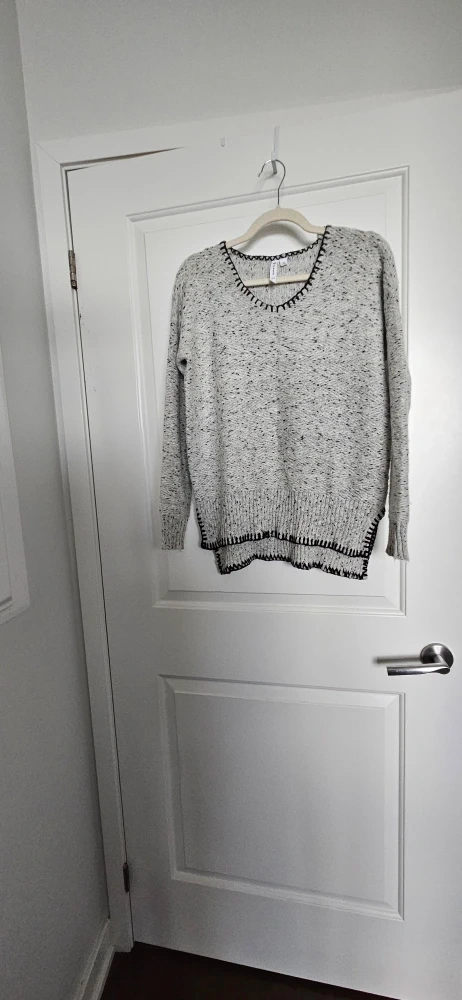 Selling a Cable & Gauge sweater in size XS (but fits a small). It's a light grey colour with black detailing around the neck and hem. It's a comfy, stylish piece perfect for layering!