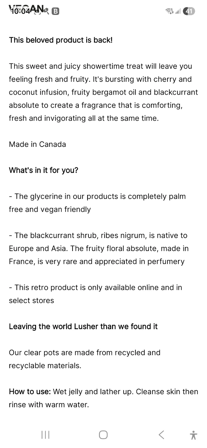 This sweet and juicy shower jelly is bursting with cherry and coconut infusion, bergamot oil, and blackcurrant absolute. It's made in Canada with palm-free and vegan-friendly glycerine. Wet jelly and lather up to cleanse skin, then rinse with warm water.