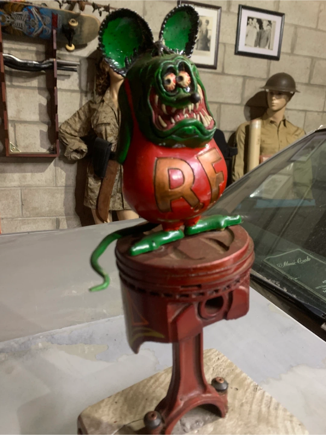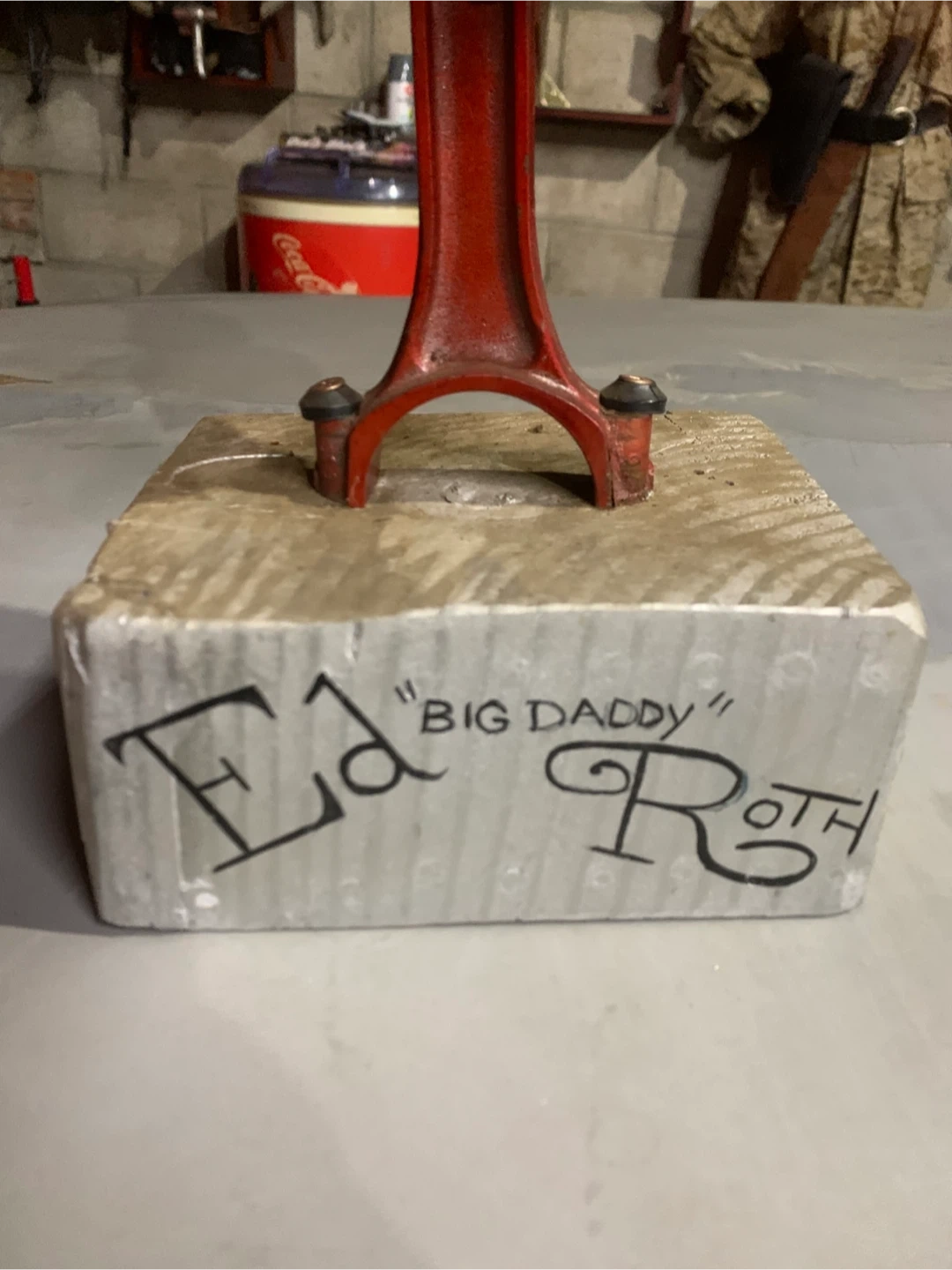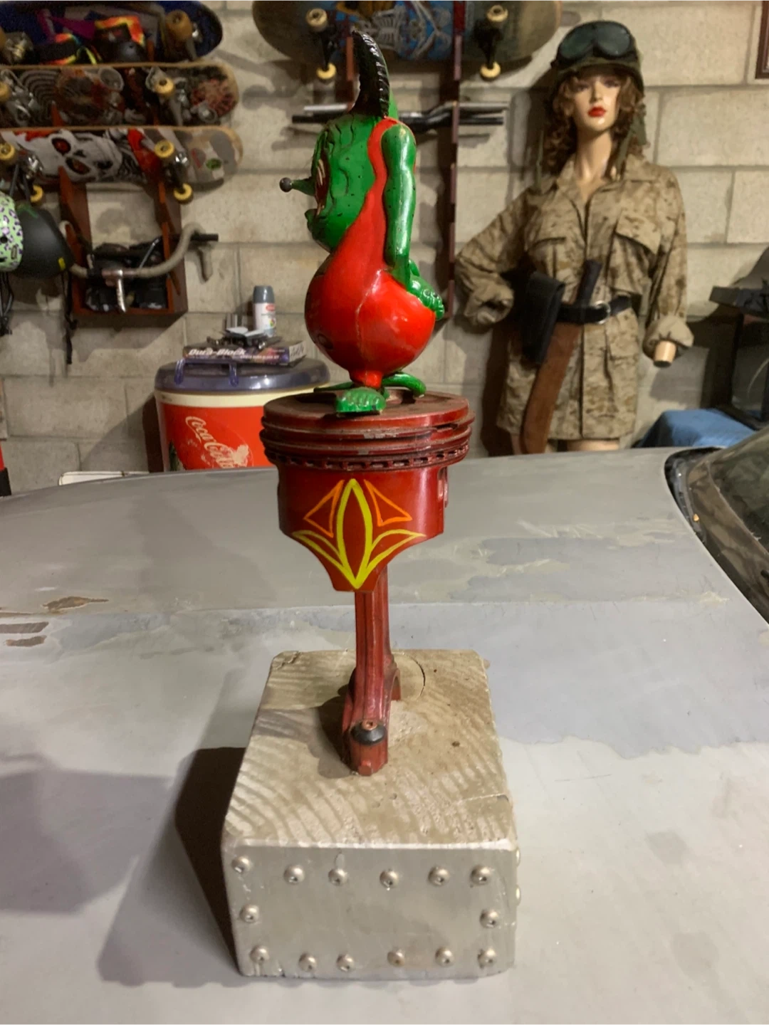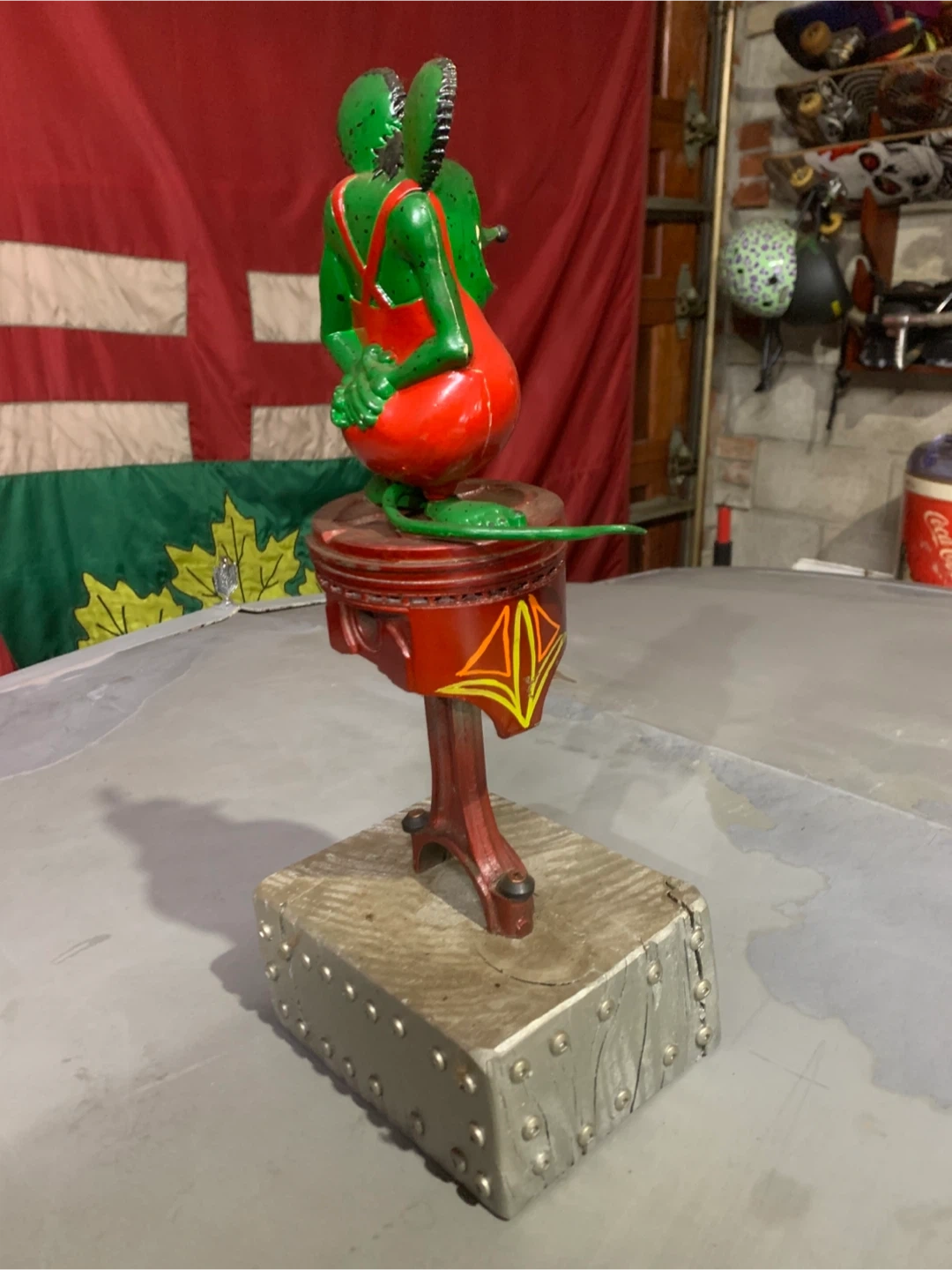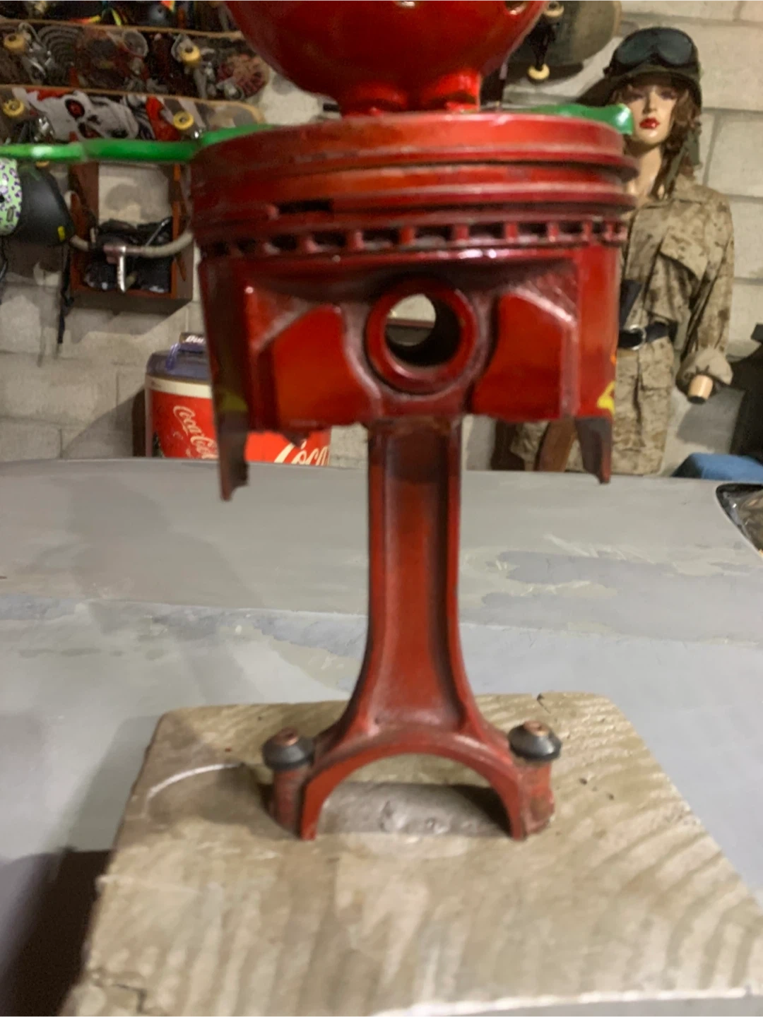 Stands just under 17” tall. Found in an old garage estate sale I have no knowledge of how old it is or the artist/maker. Needs to be cleaned It is really dirty from age and may smell like car exhaust & cigars lol. Figure is made of hollow hard plastic. The piston is a real metal car piston with a solid wood base.