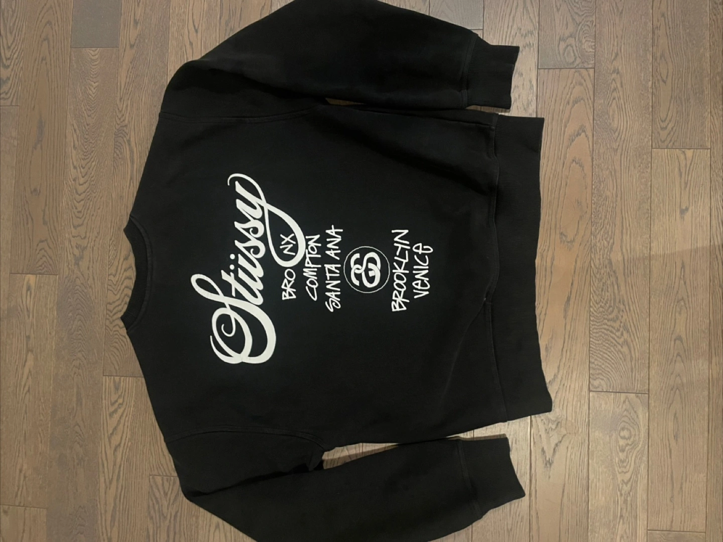 Black Stüssy crewneck sweatshirt. Size Large. Features various city names including New York, Los Angeles, Tokyo, London, and Paris. Made in Romania.