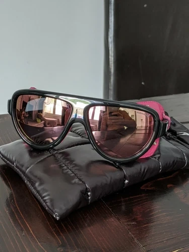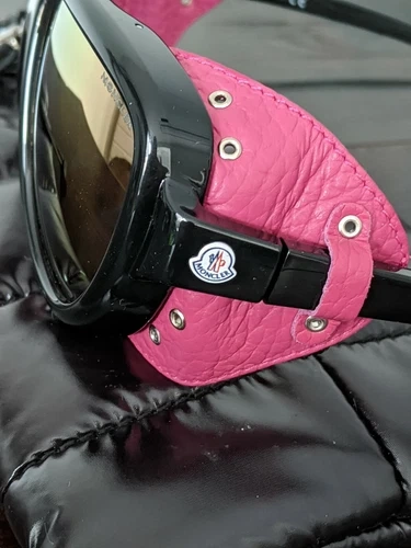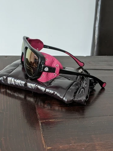 Brand new Moncler ML 0089 01Z sunglasses. Comes with the original Moncler jacket-style case and lens cleaning cloth. Guaranteed 100% authentic. These are shield-style acetate sunglasses in black with pink lenses offering 100% UV protection. Features integrated rubberized nose pads and logo etched at the lens. The hinges have a white logo stamp and tonal grained leather trim with eyelet detailing. Rubberized trim at the temple tips.