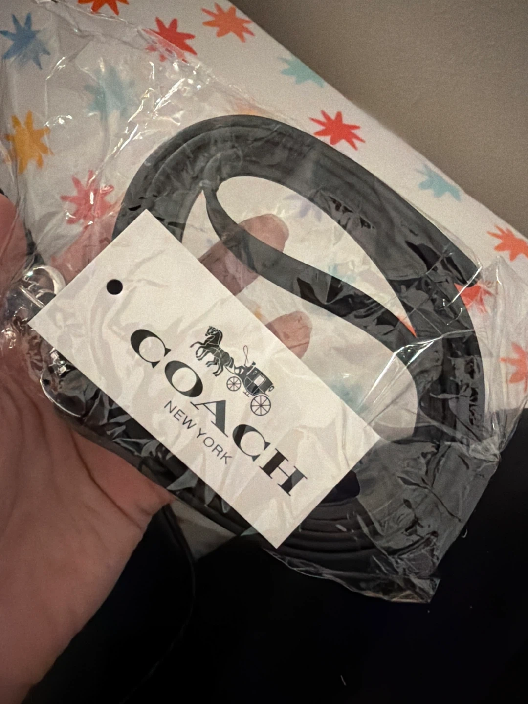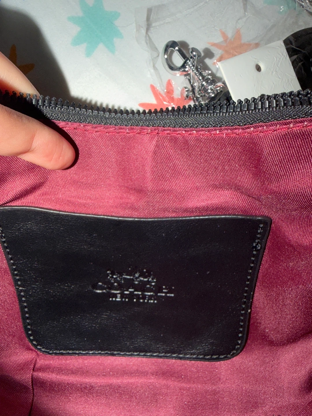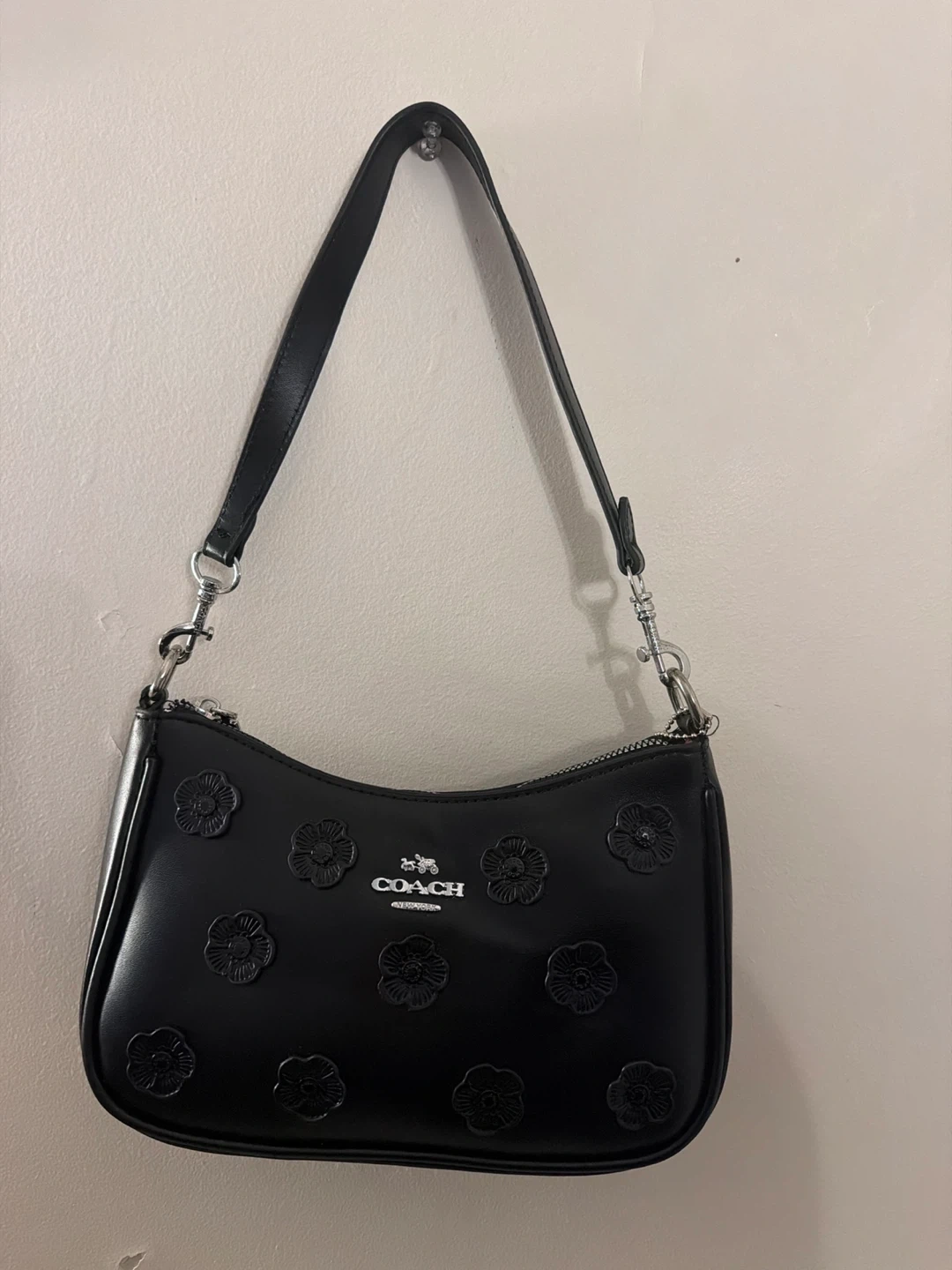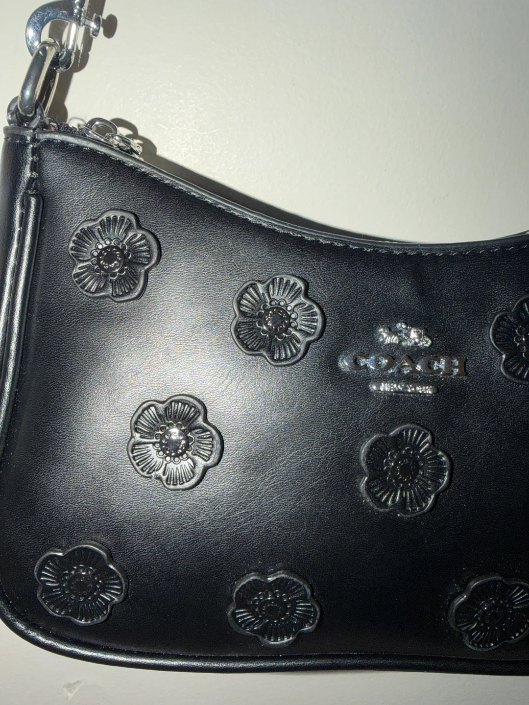 This is a black leather shoulder bag from Coach. It features a floral embossed design all over. The bag has a single strap with silver-tone hardware.