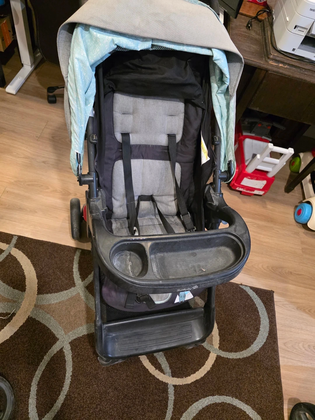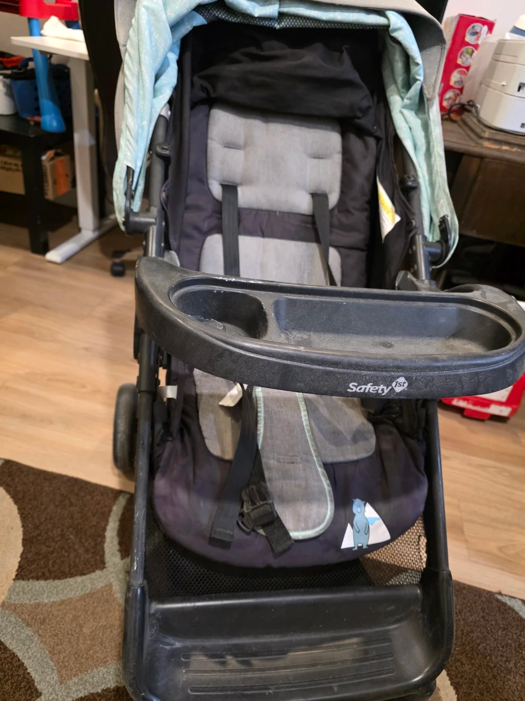 This is a Safety 1st stroller with a removable tray and a canopy. It has a five-point harness for safety. Stroller is grey and black.