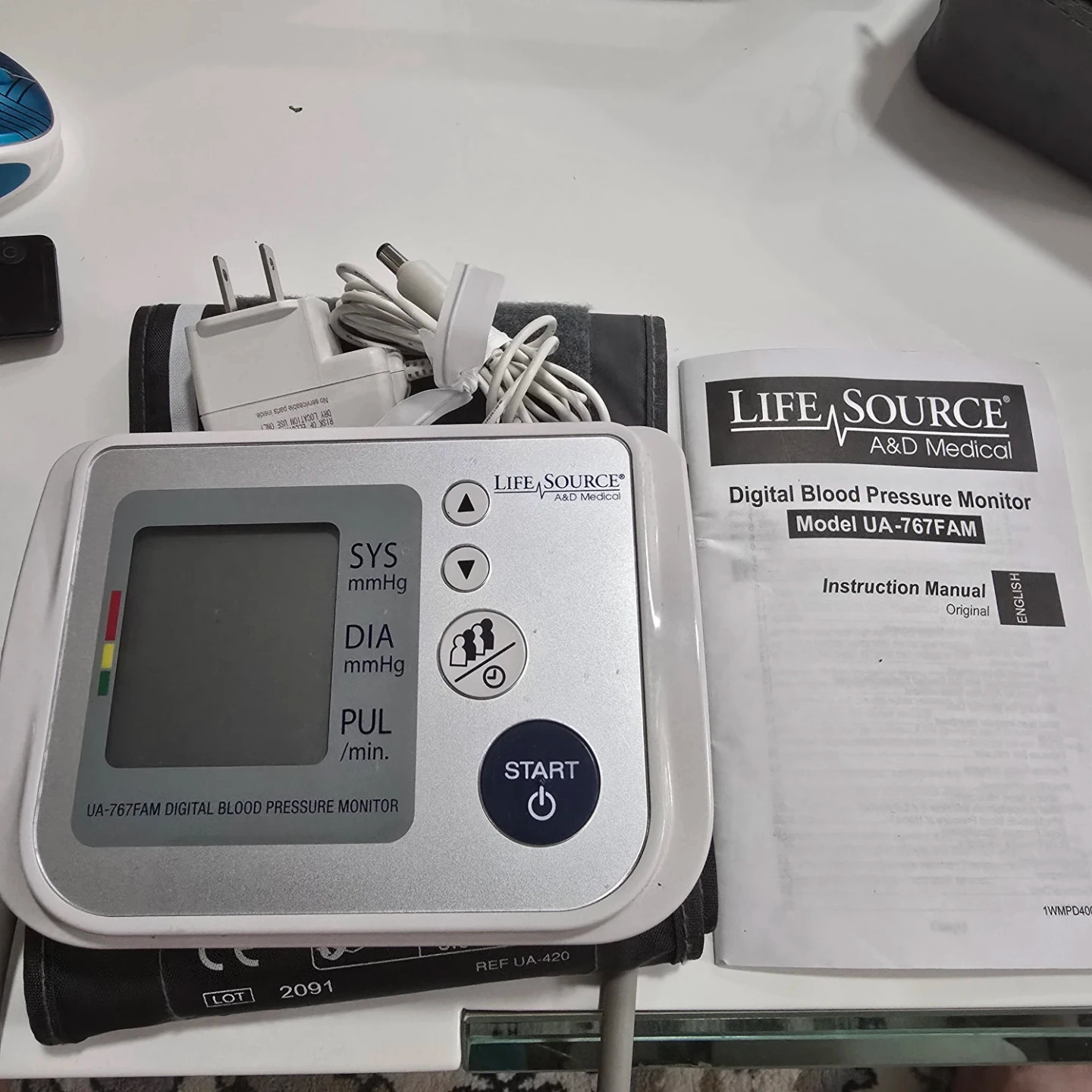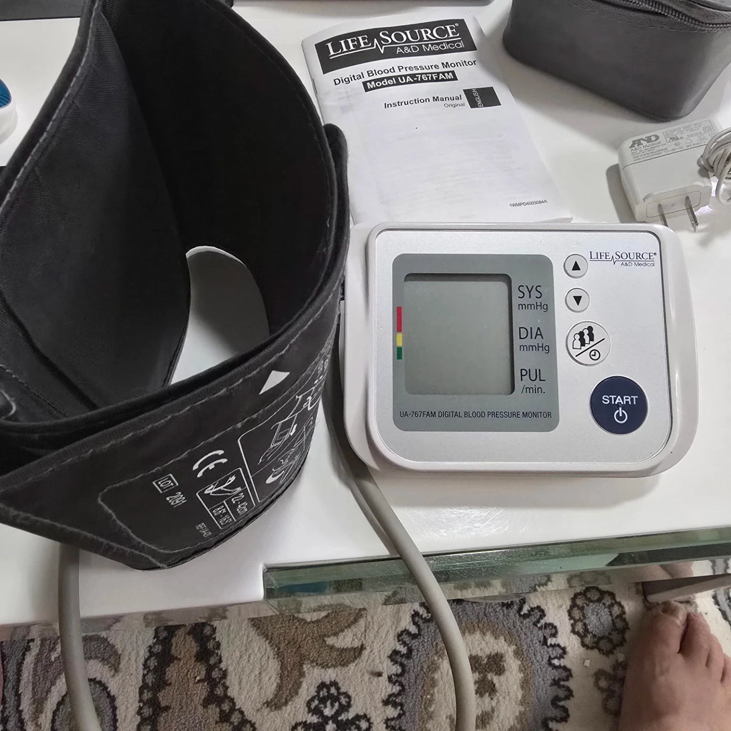 This is a Life Source digital blood pressure monitor, model UA-767FAM. It's a medical device for home use. It comes with an arm cuff that fits arm circumferences of 22-42cm (8.6"-16.5"). Includes the instruction manual and a travel bag.