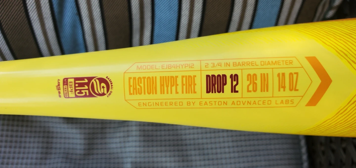 This is an Easton Hype Fire baseball bat. It's a drop 12 model, measuring 26 inches and weighing 14 ounces. The barrel diameter is 2 3/4 inches. It's engineered by Easton Advanced Labs.