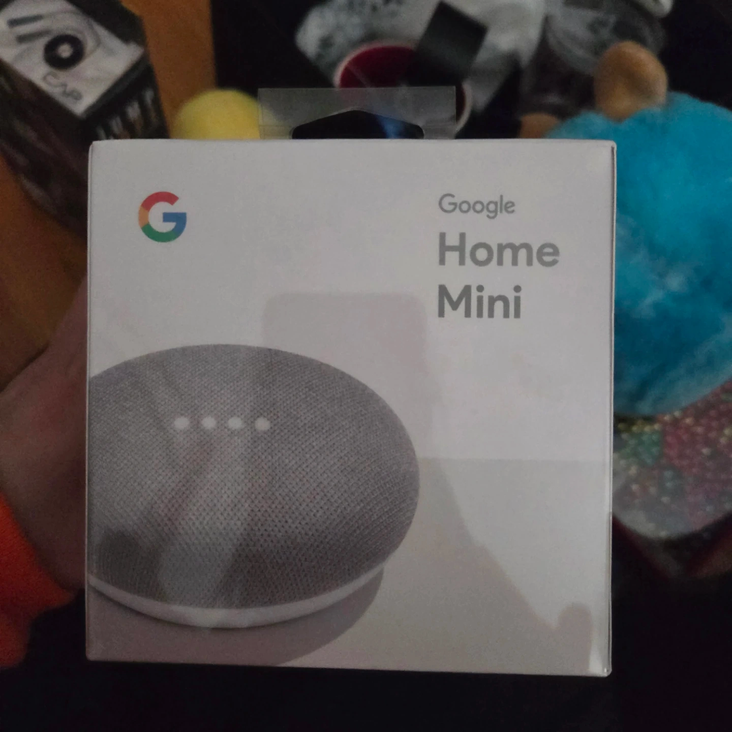 This is a Google Home Mini smart speaker. It's a compact device for voice commands and music playback. It comes in a light grey fabric finish.