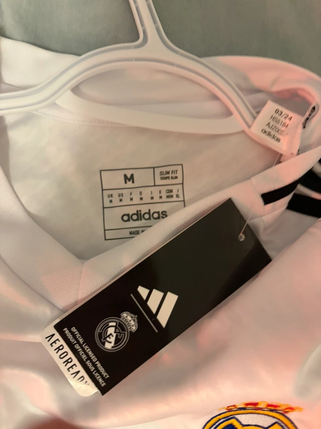 White Adidas Real Madrid CF jersey with Emirates Fly Better sponsor. It's a size medium with a slim fit. AEROREADY material keeps you dry. This jersey is made for fans and players alike!