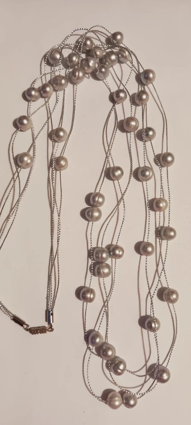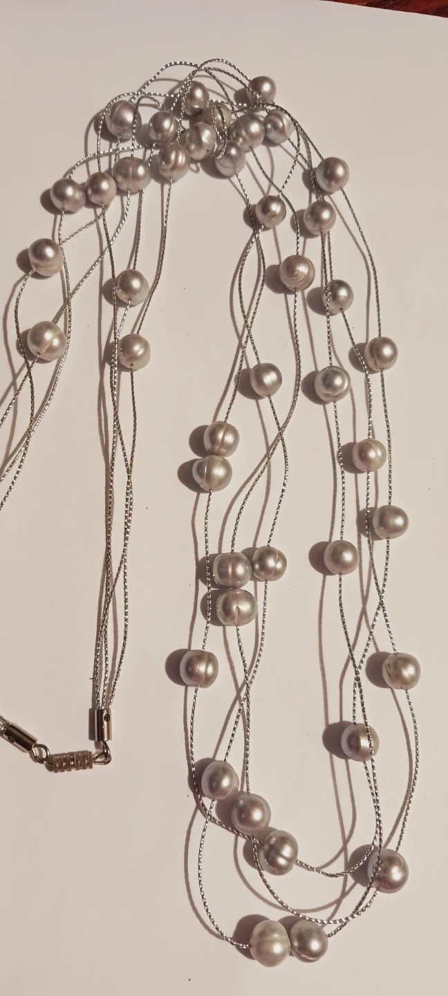 Gorgeous Genuine Freshwater Pearl Multi Strand Necklace. The pearls are strung on thin, silver-toned cords. Excellent condition. 32" long