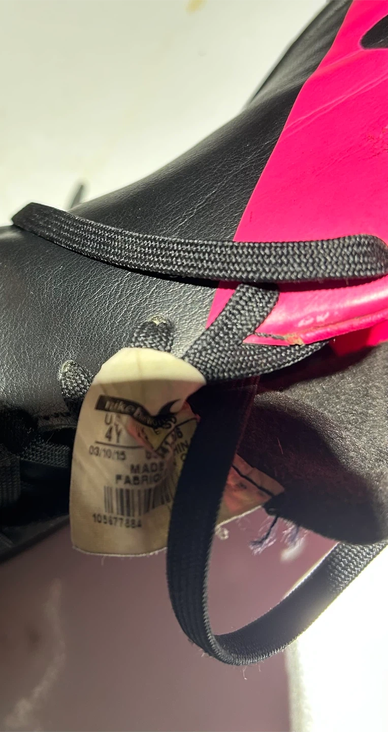 These Nike Mercurial soccer cleats are black with bright pink accents. They're a youth size 4Y. The soles are designed for turf play. Manufactured on October 3rd, 2015.