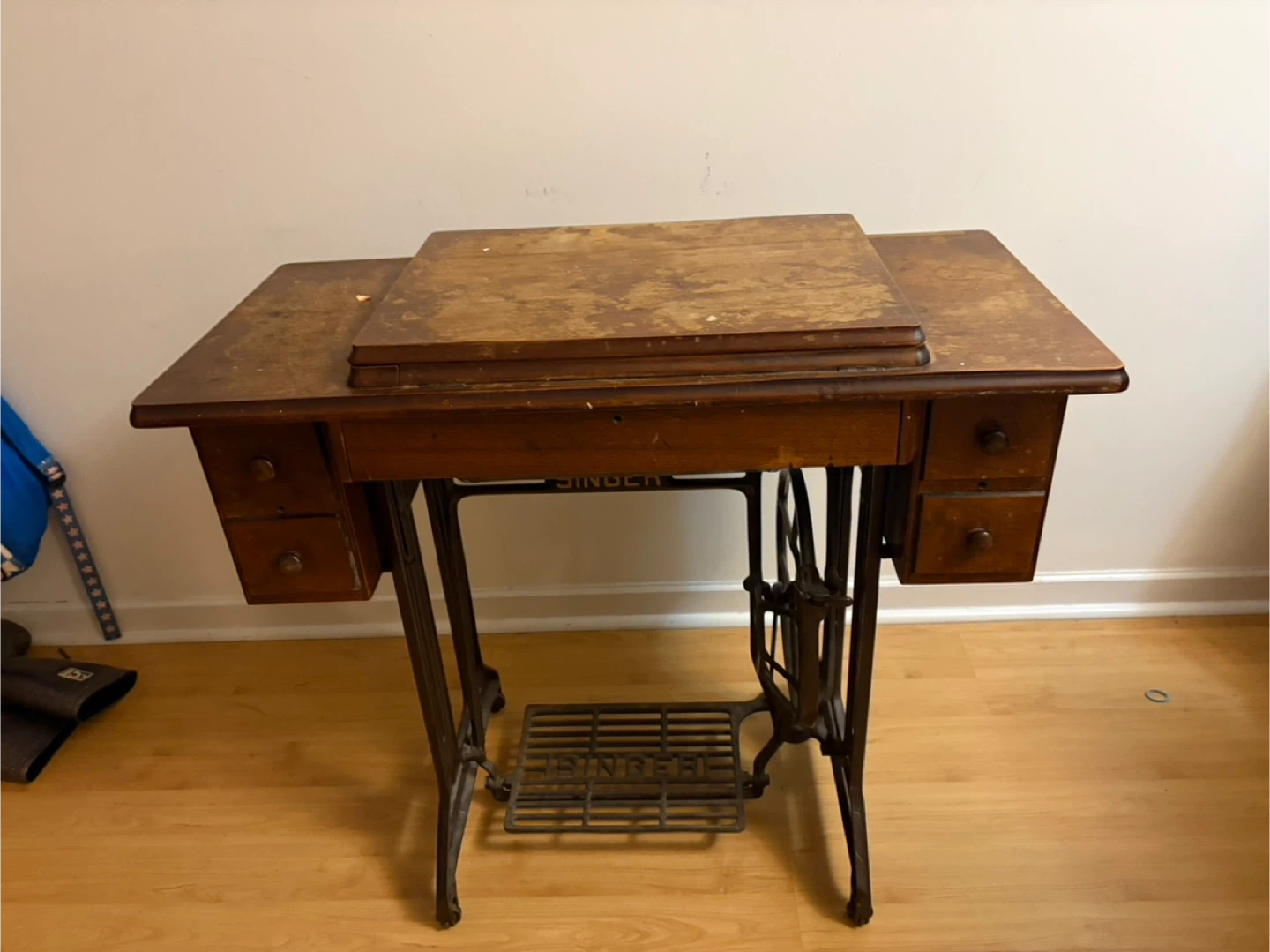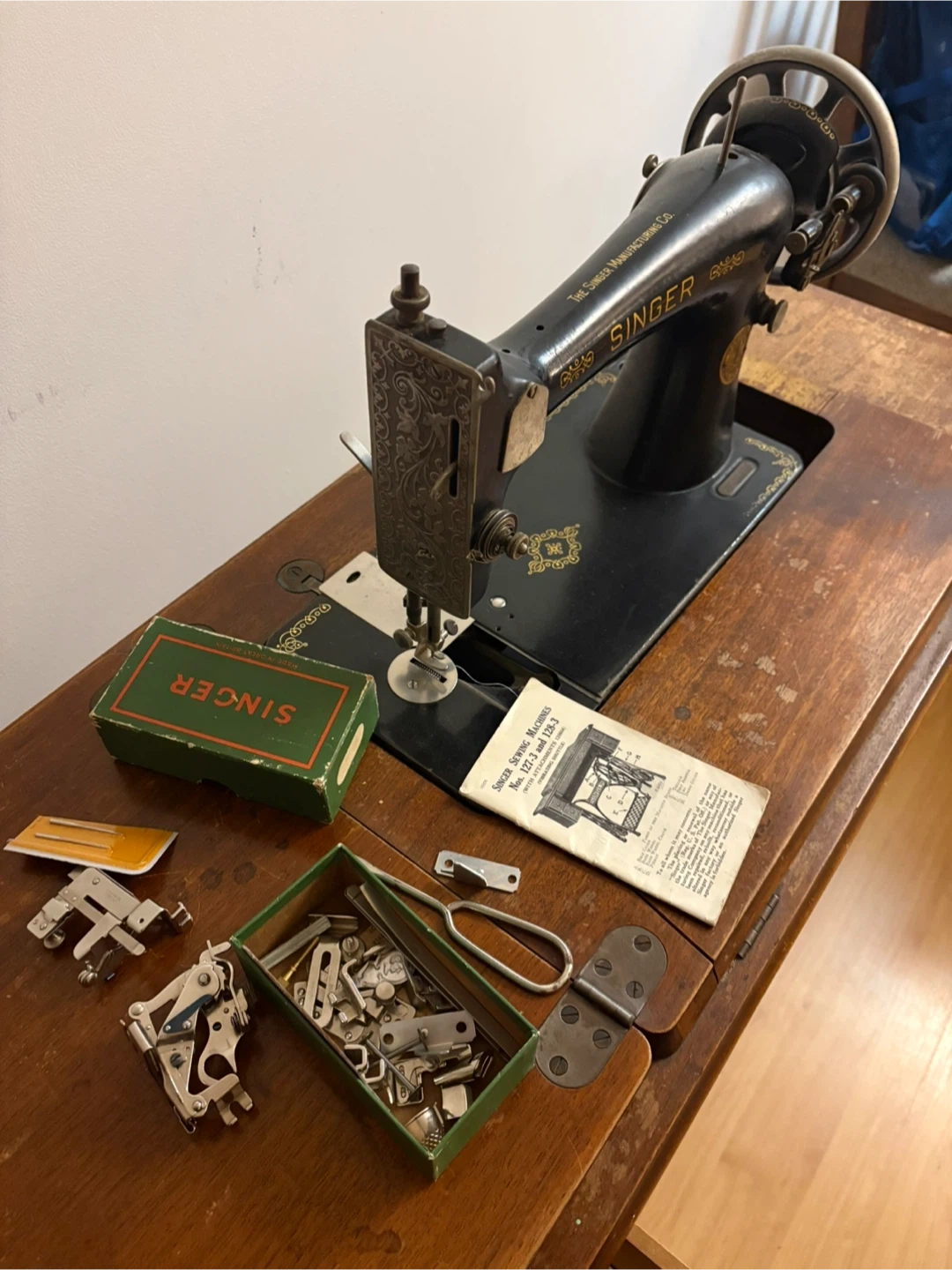 Selling a vintage Singer sewing machine with its original table! It shows signs of wear and tear, but it's a beautiful piece of history. Includes the sewing machine, table, and some accessories as pictured.