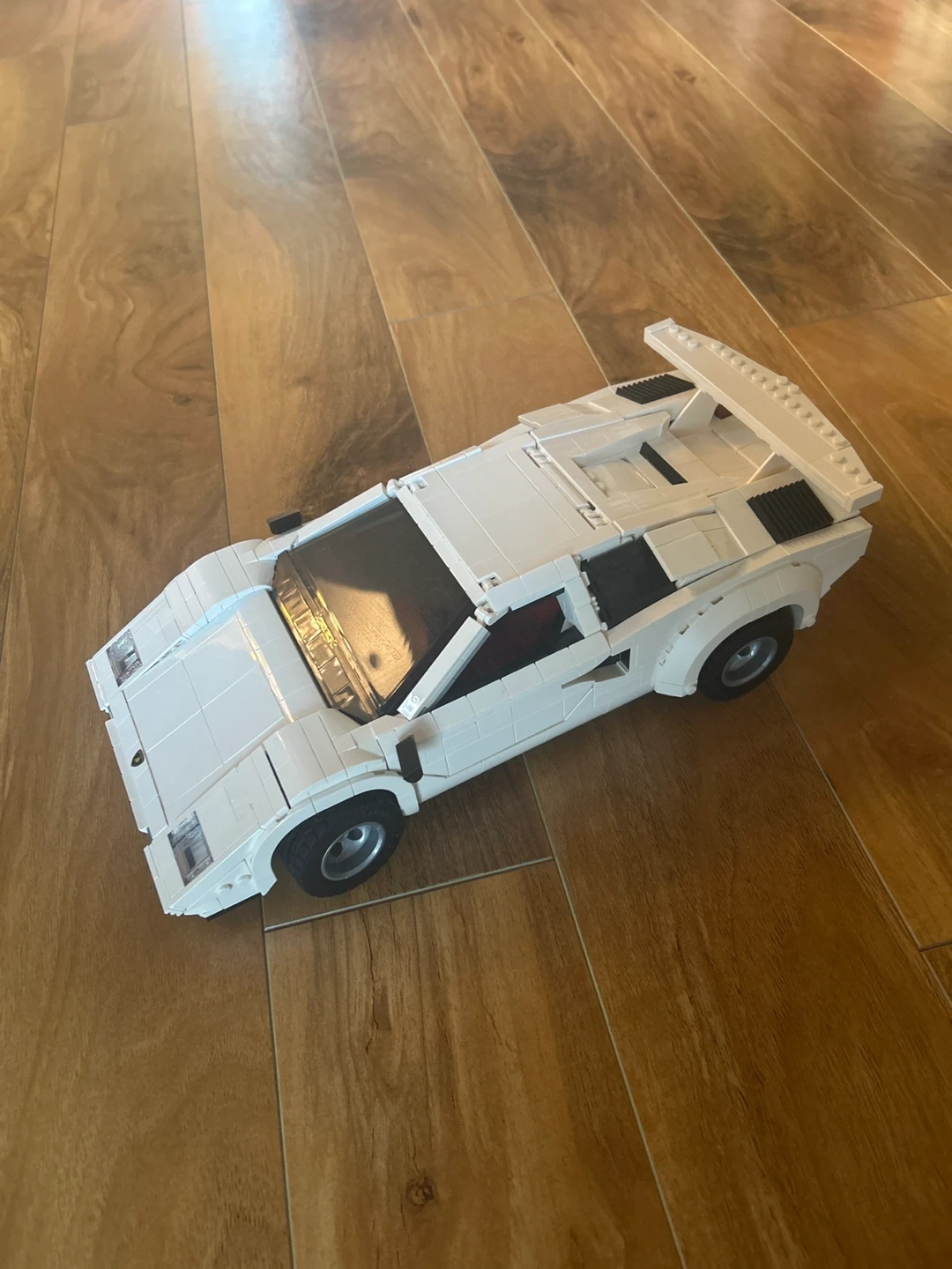 This is the LEGO Technic Lamborghini Countach LPI 800-4 set. It's a detailed 1:8 scale model. Built from white LEGO bricks, it features opening doors and a rear spoiler.