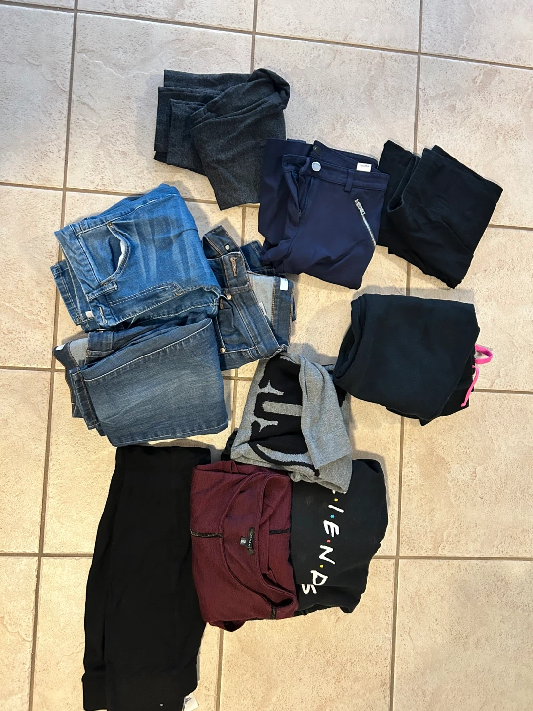 This bundle includes several pairs of women's pants and tops. Items feature jeans, leggings, and sweaters. Fabrics include denim, cotton blends, and other comfortable materials. Sizes range from x-small to small and size 0-2. From a smoke free and pet free home.