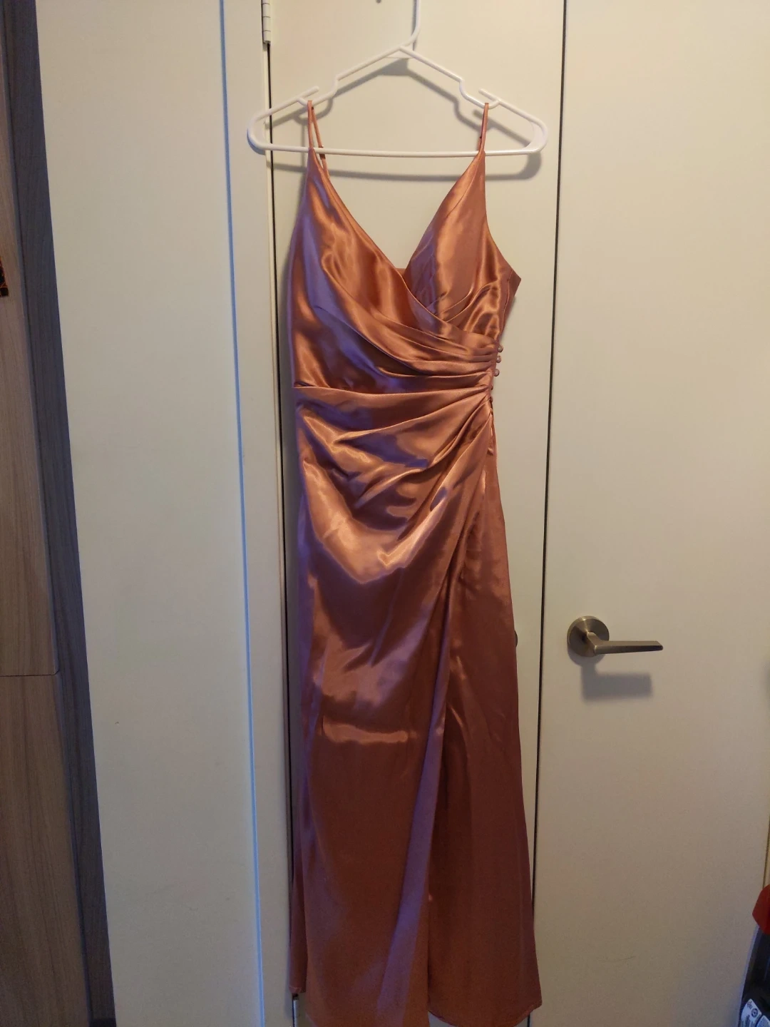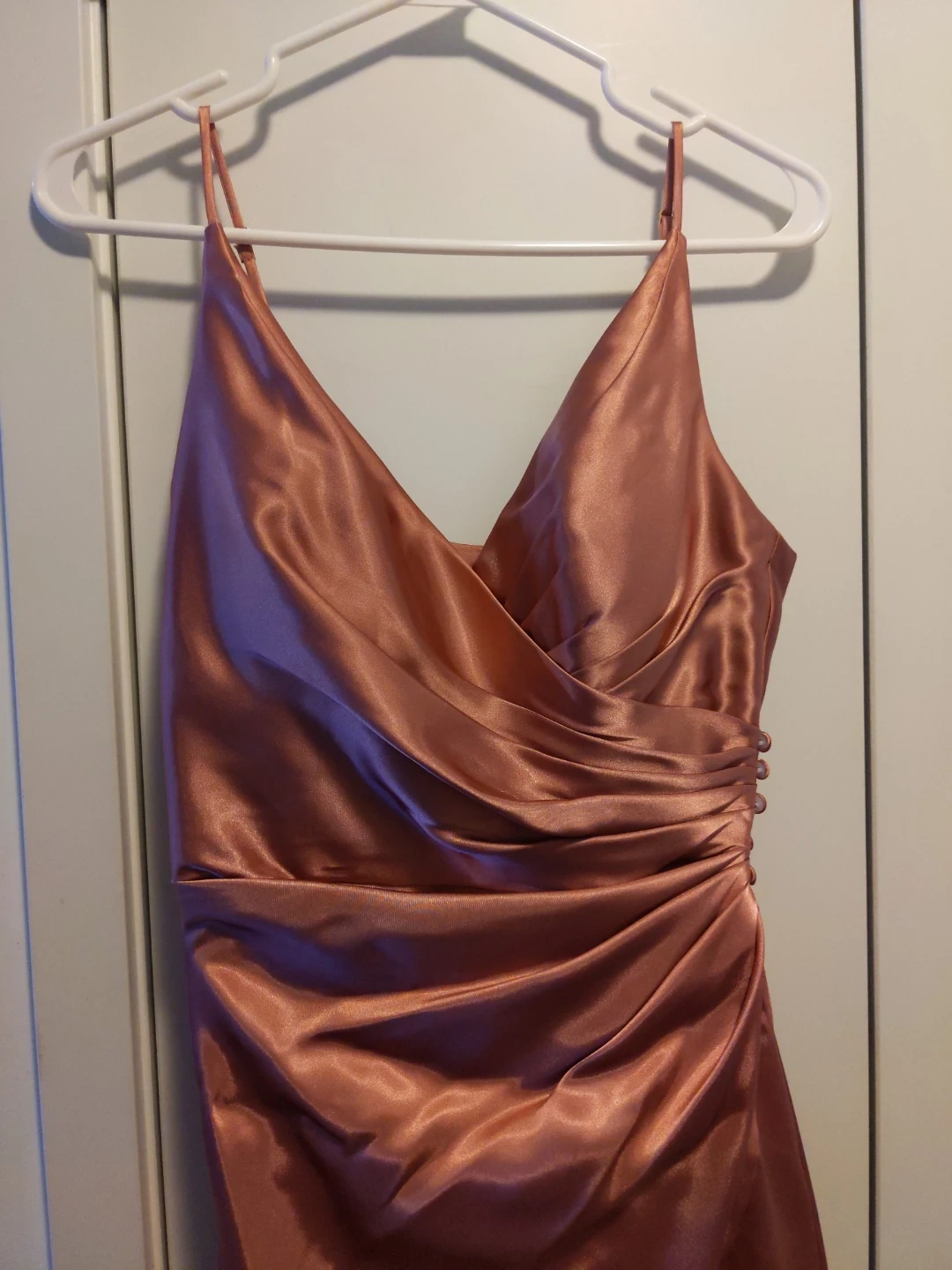 This elegant rose gold satin slip dress features a flattering ruched detail. It's perfect for a formal event or a night out. The fabric has a beautiful sheen.