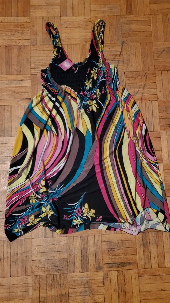 Sleeveless dress with a floral print and colourful stripes. The dress has an elastic band around the waist.