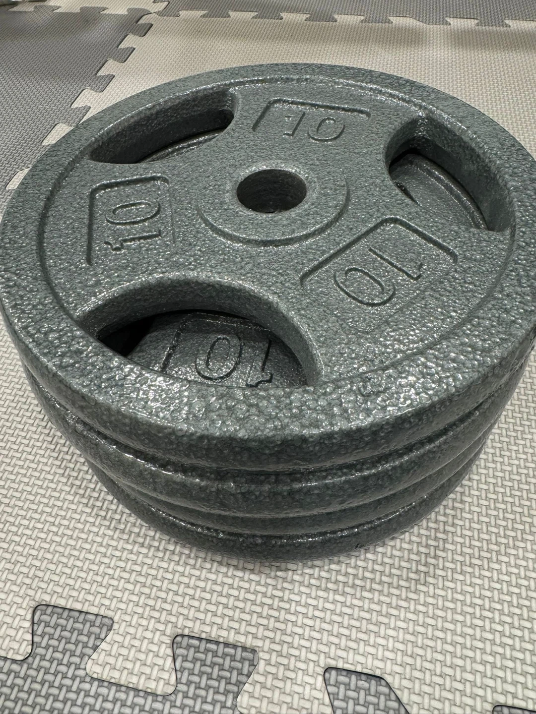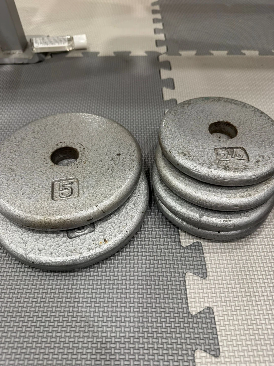 Set of assorted weight plates. Includes four 10lb plates, two 5lb plates, and two 2.5lb plates. Cast iron construction.