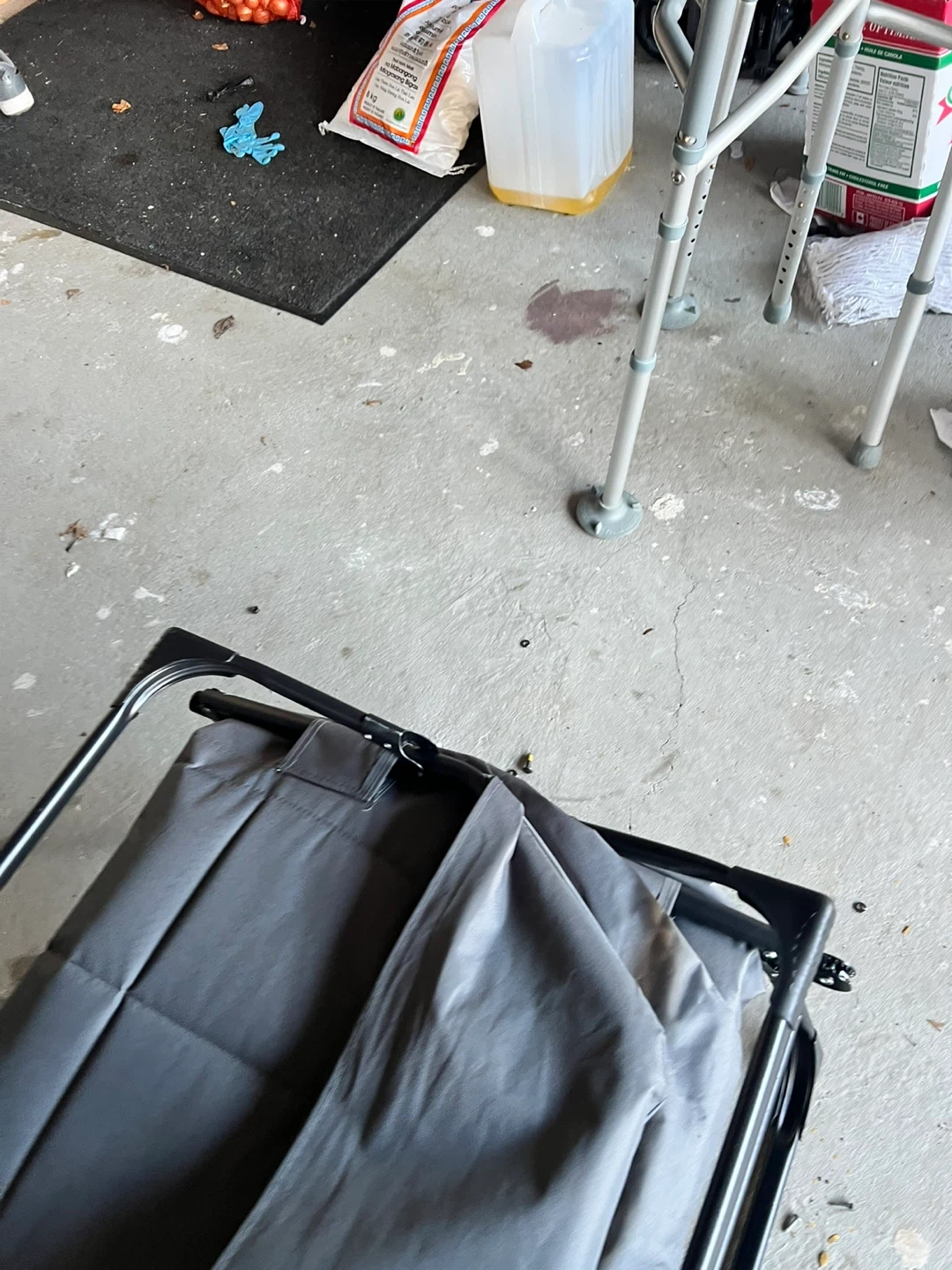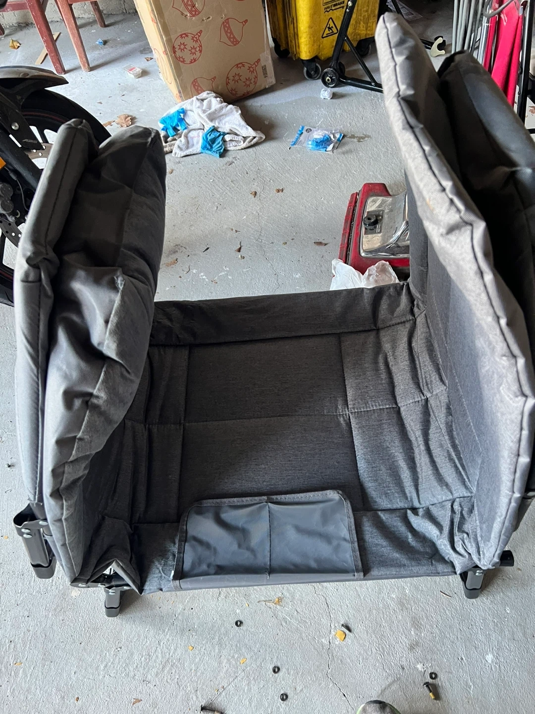Grey folding camp chair with a durable metal frame. It's made of fabric and folds up compactly for easy transport. This chair is great for camping trips or outdoor events.