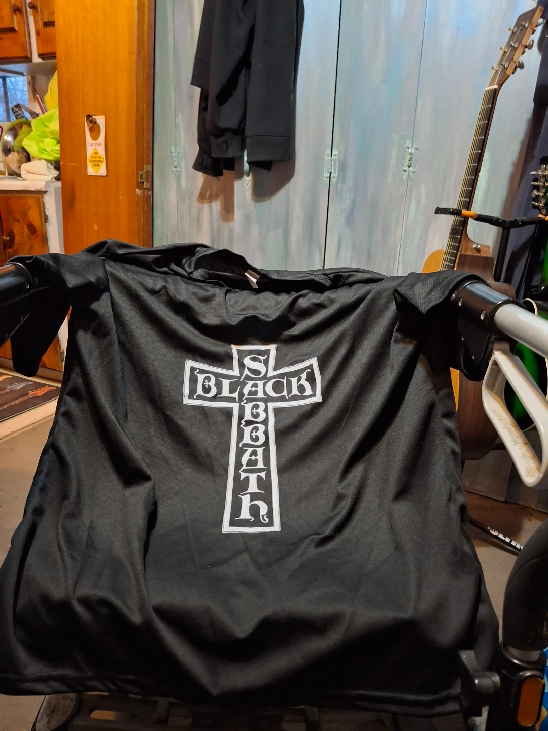 Black t-shirt featuring the iconic Black Sabbath cross logo. It's made of a breathable, lightweight fabric, perfect for concerts or casual wear. A must-have for any fan!