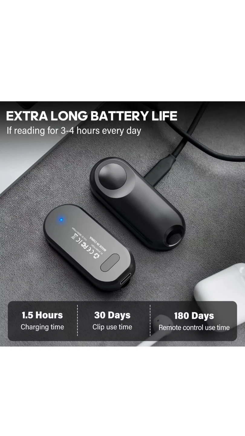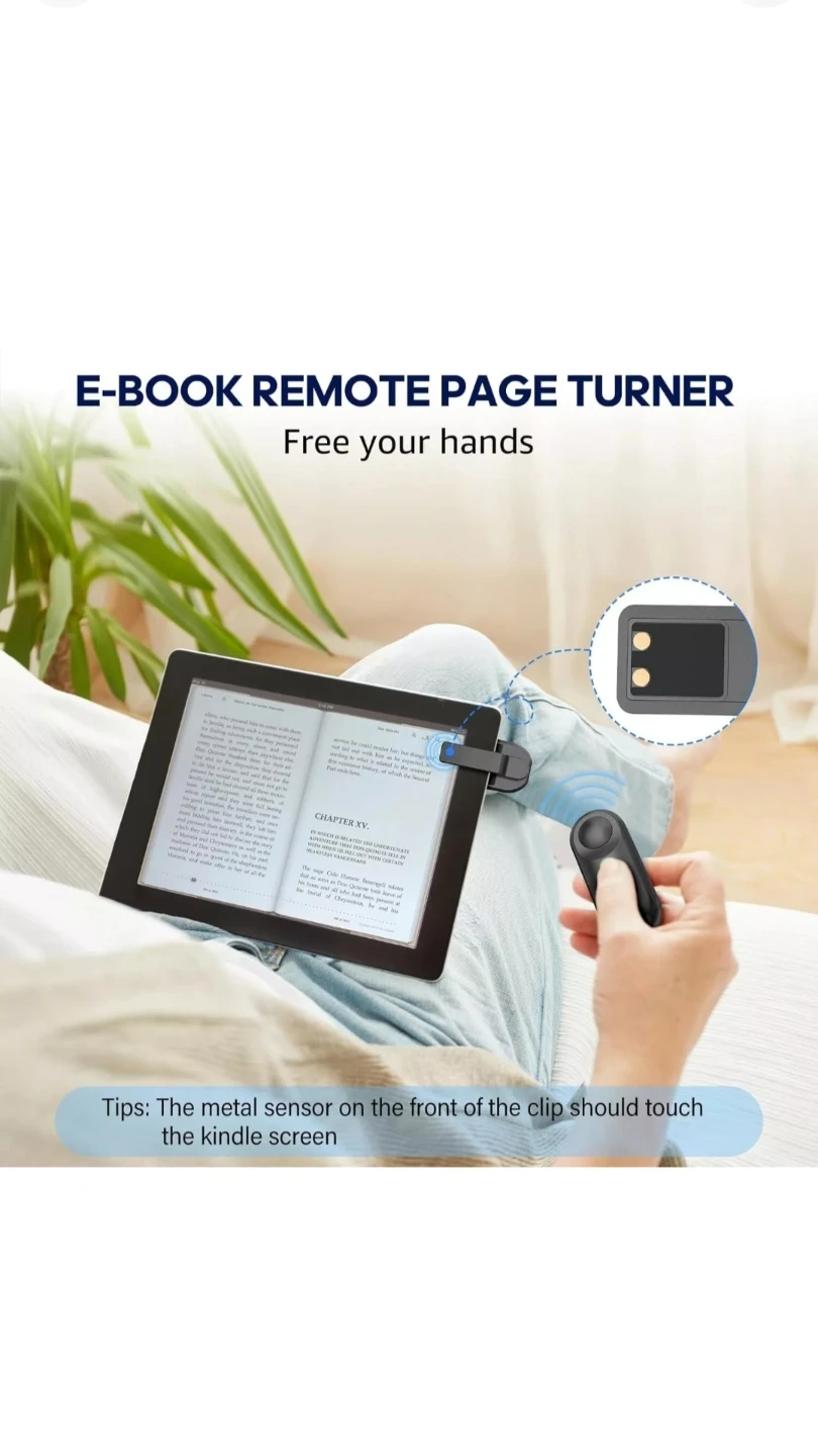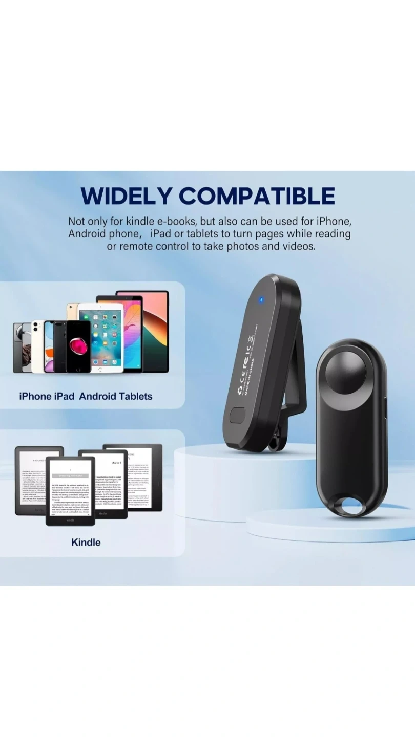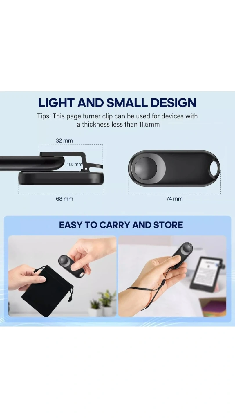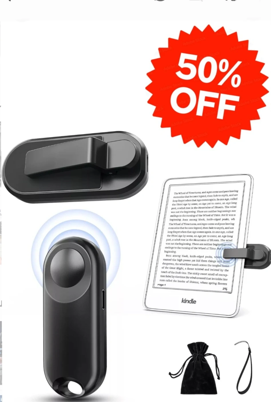 This wireless page turner remote allows you to flip pages on your Kindle, iPhone, or Android device without touching the screen. It has a long battery life and is compatible with most e-readers and phones. The device is lightweight and easy to carry with its included pouch.