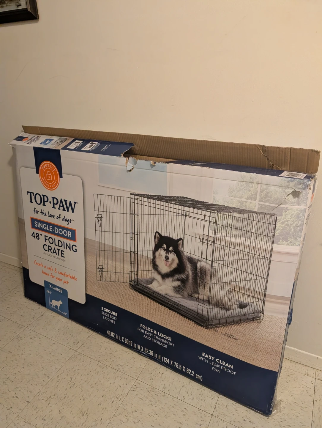 This is a Top-Paw 48-inch single-door folding dog crate. It features two secure slide bolt latches for the door. The crate folds and locks for easy transport and storage. It includes an easy-clean, leak-proof pan.