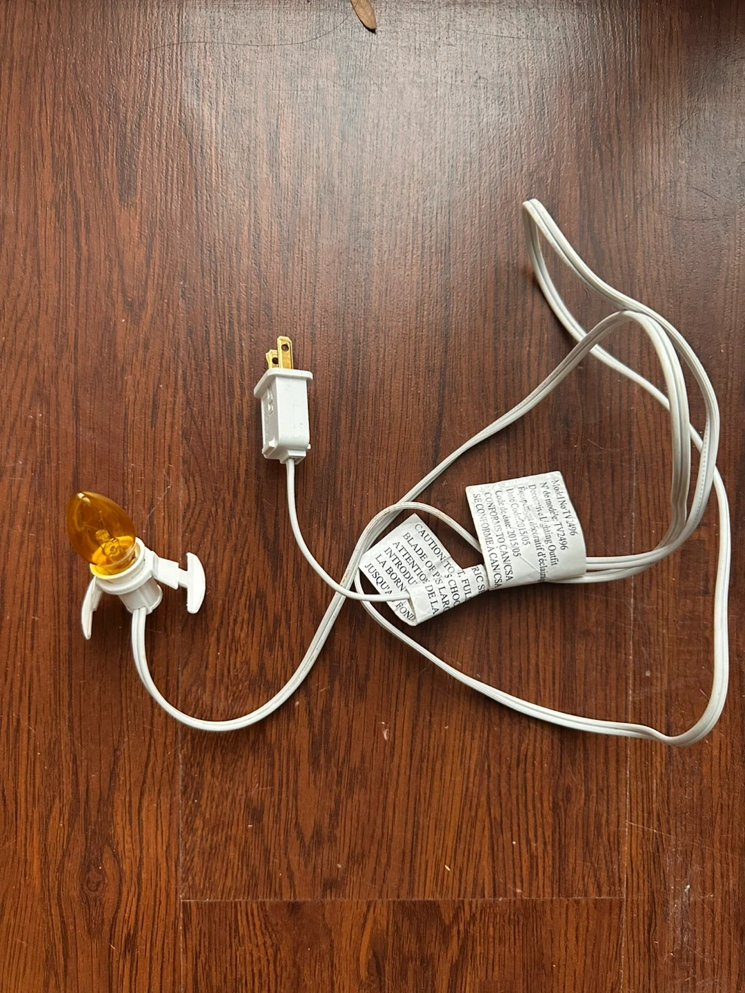 Single yellow C7 Christmas light bulb with a white cord. This bulb is a warm yellow colour and is ready to be used for your holiday decorating! It's a standard replacement bulb for many string light sets.
