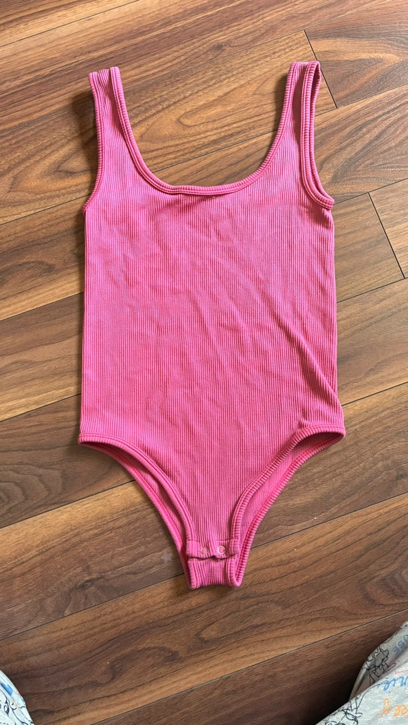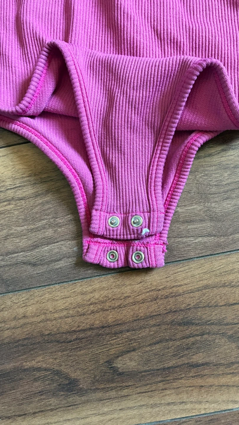 A comfortable ribbed pink tank bodysuit. It features a scoop neckline and snap closure at the crotch. This bodysuit is made from a stretchy knit fabric.
