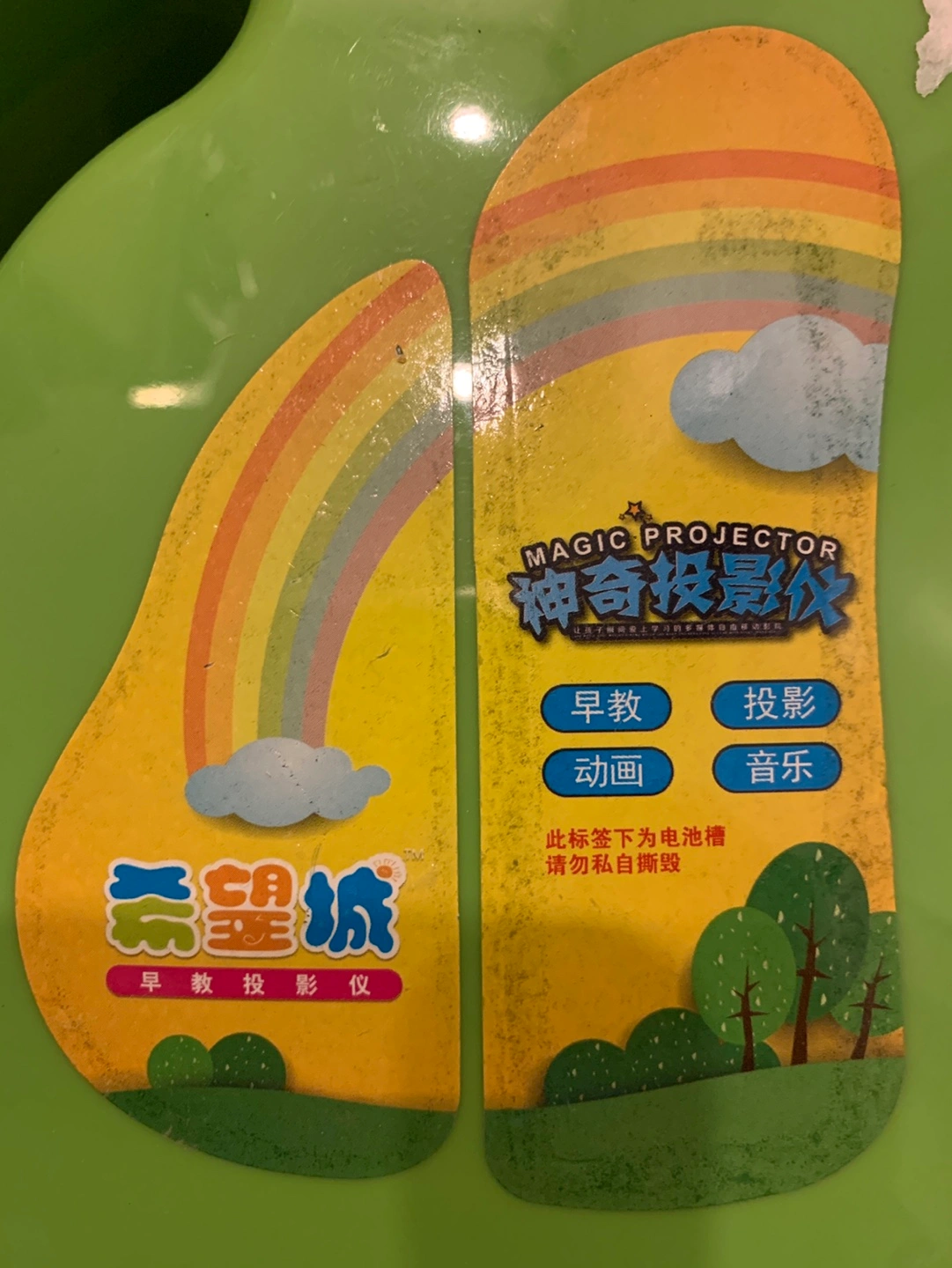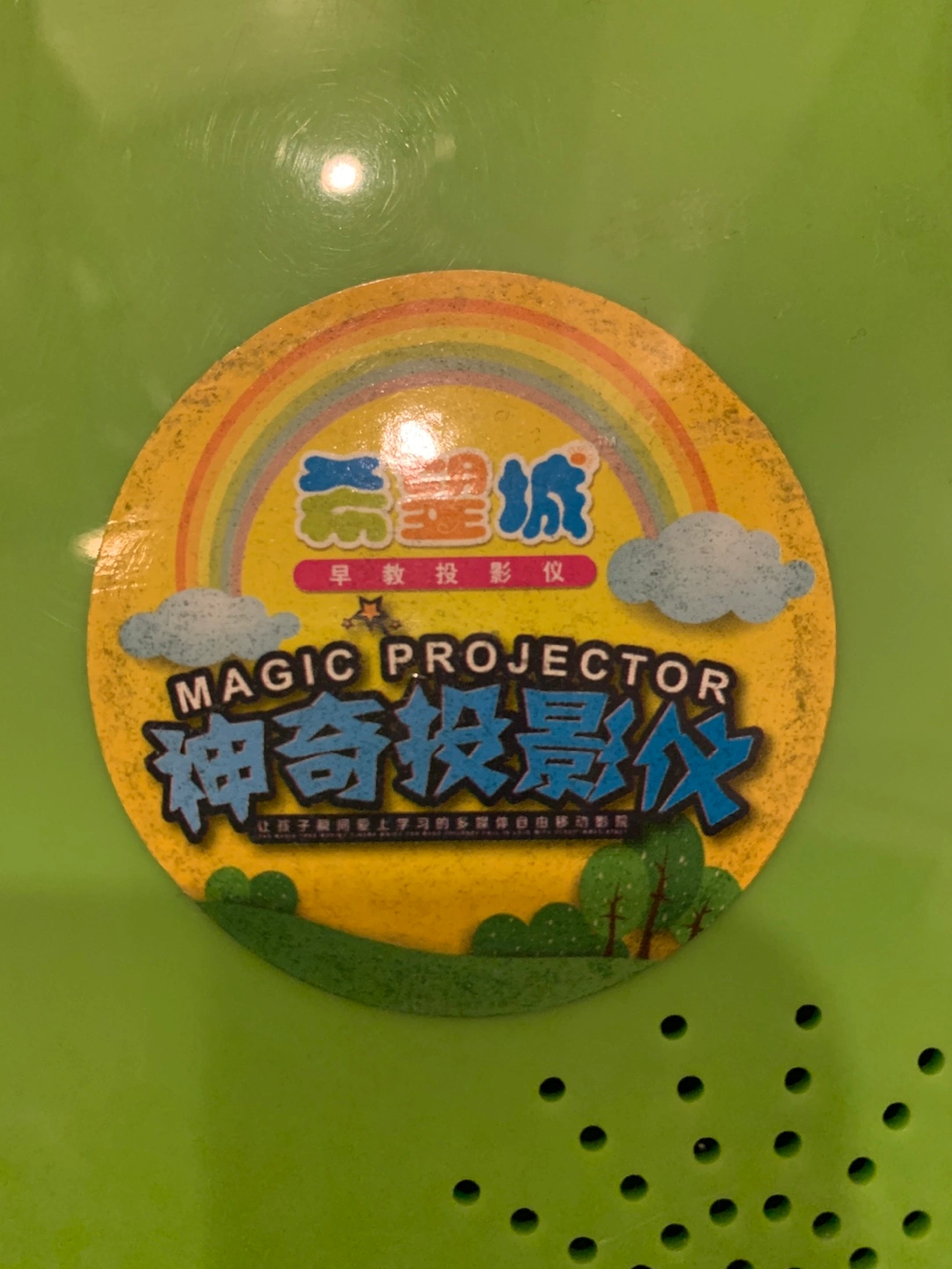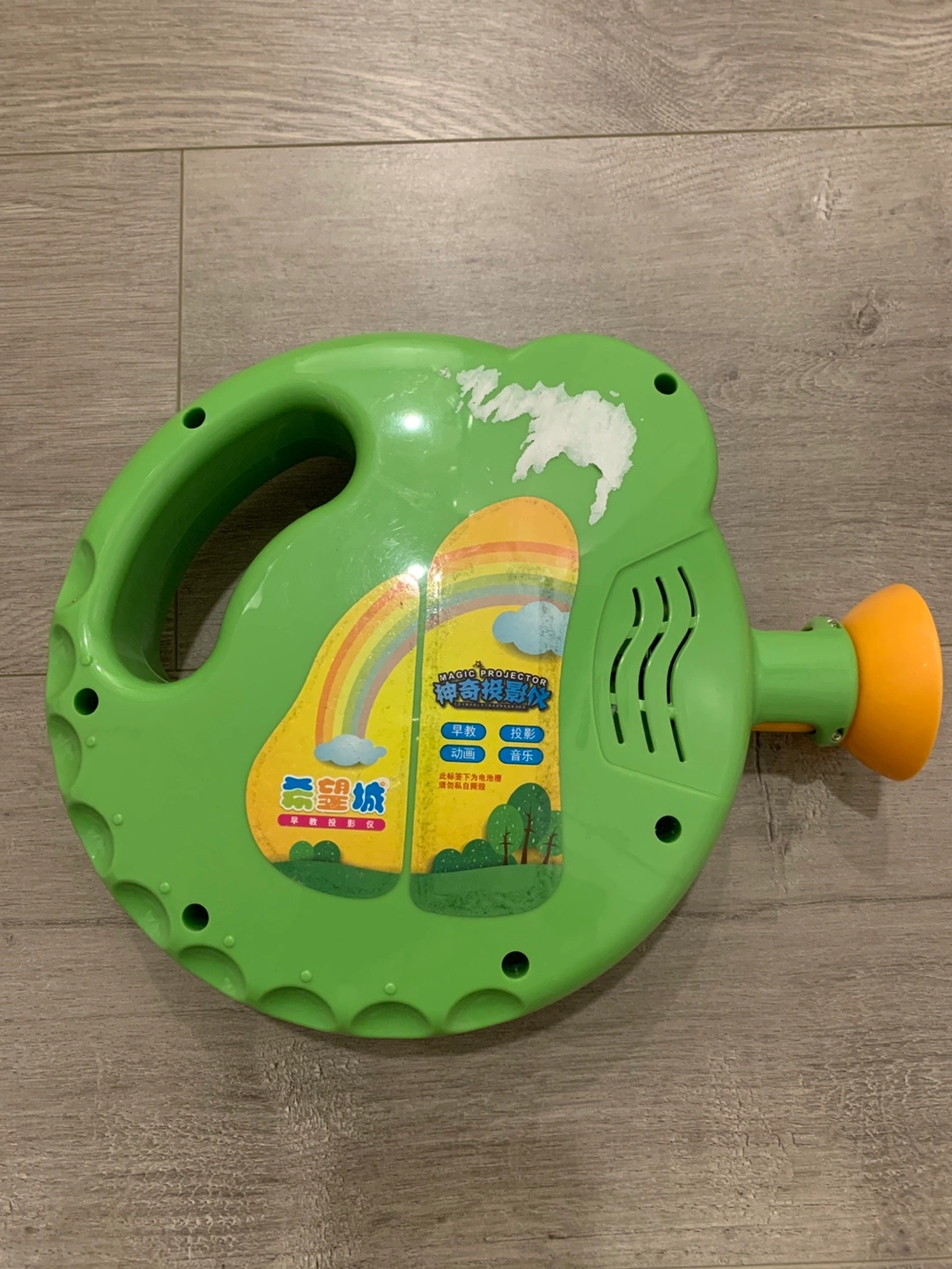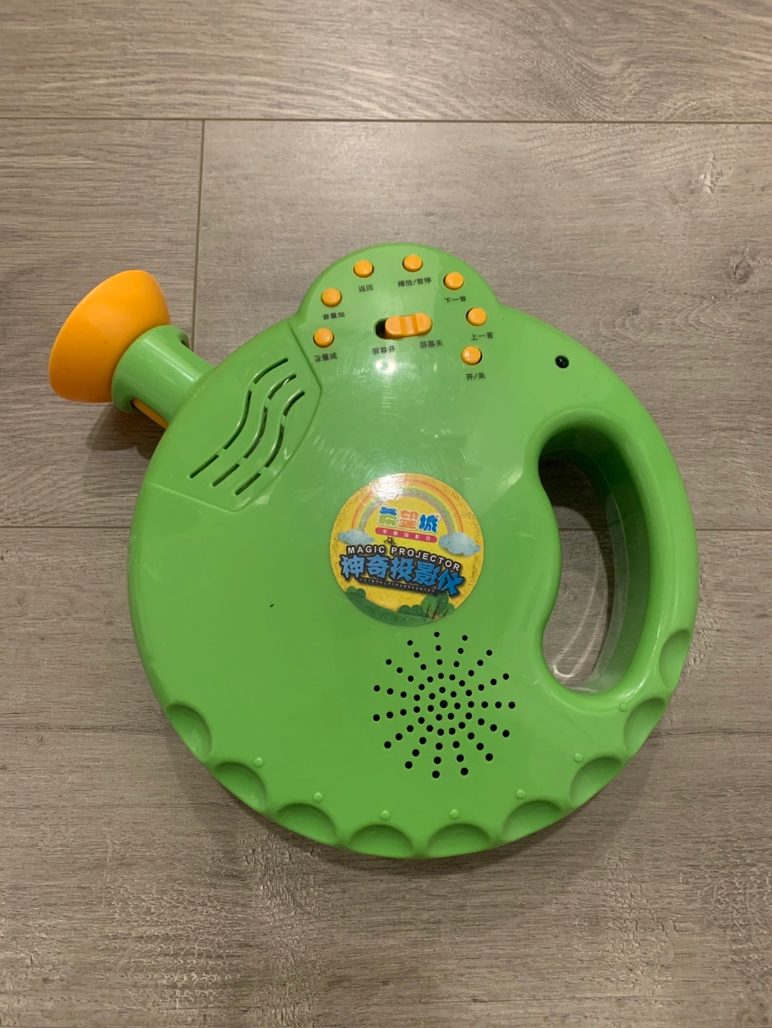 Green projector toy with buttons, a handle, and a projector lens. Plays music , educational games and projects images.