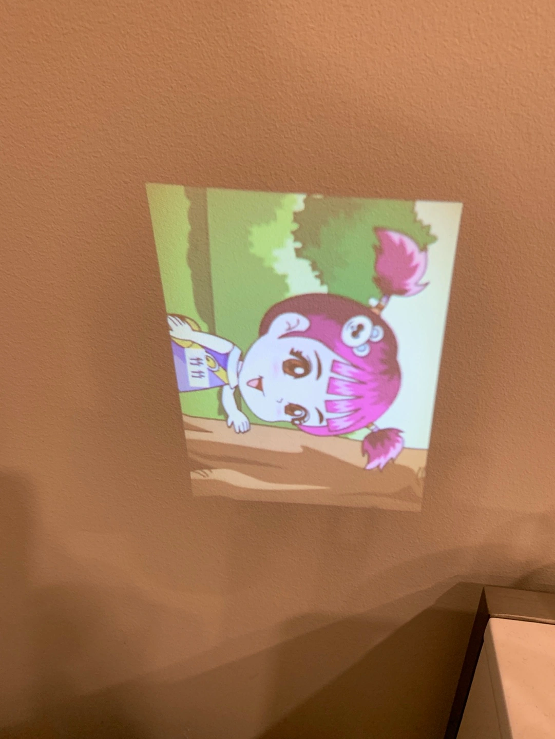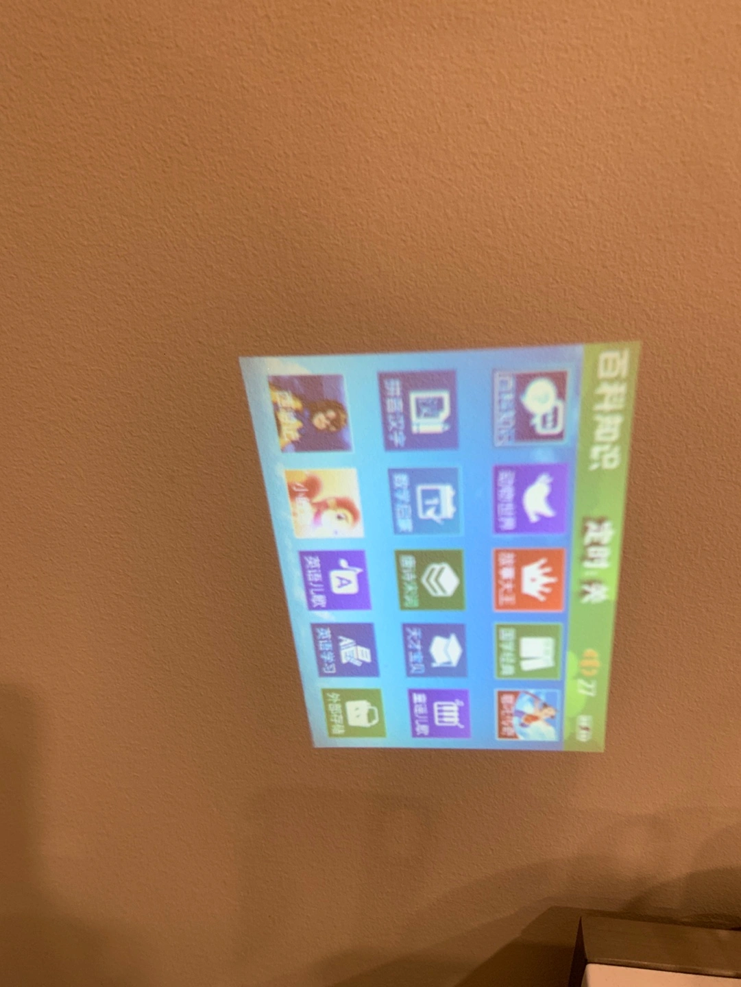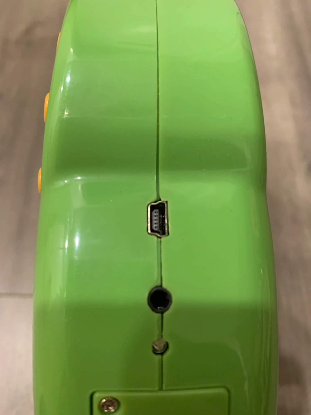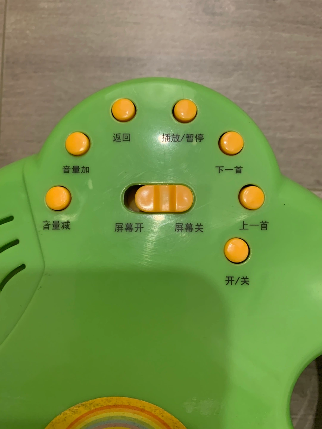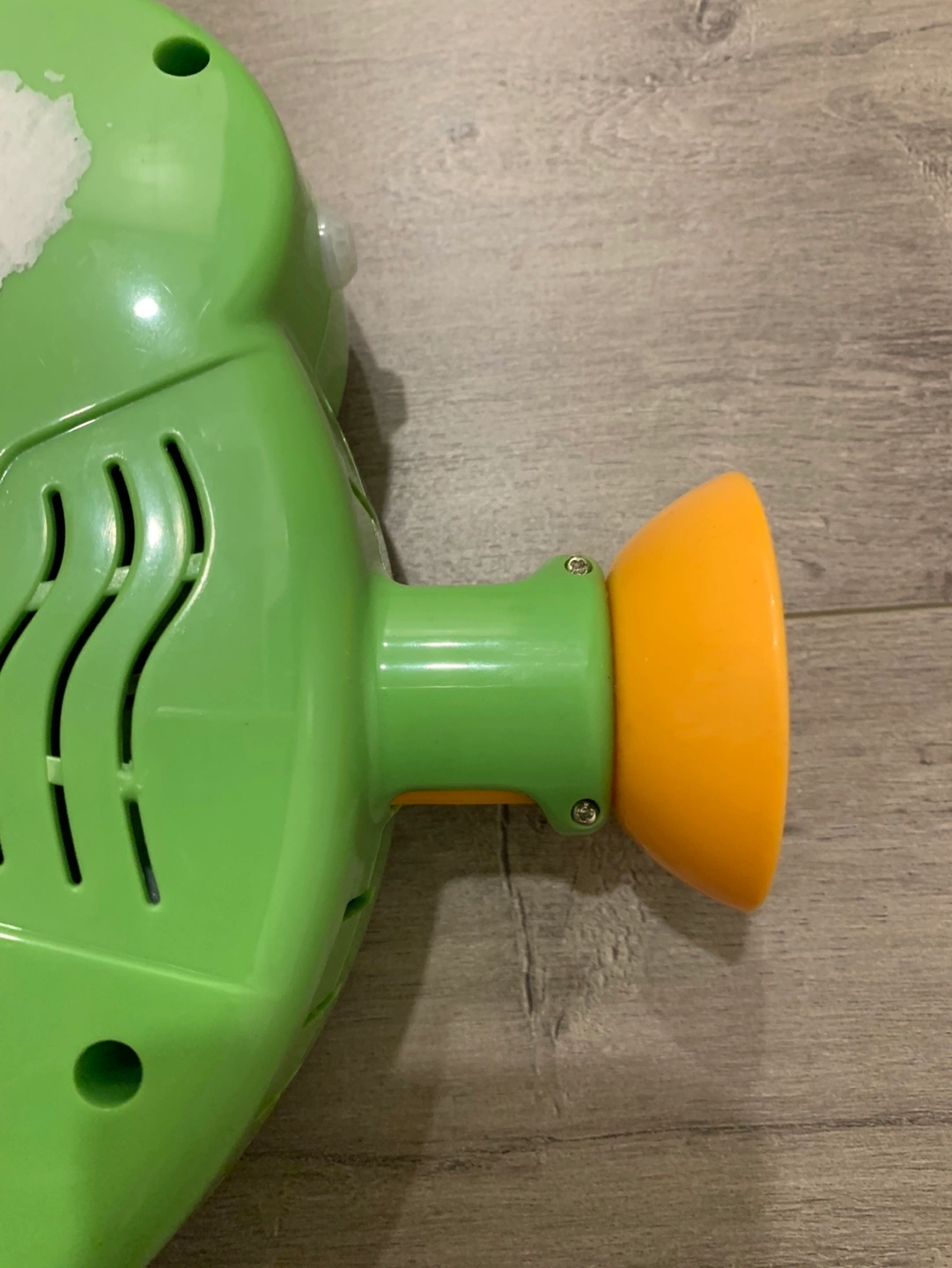 Green projector toy with buttons, a handle, and a projector lens. Plays music , educational games and projects images.
