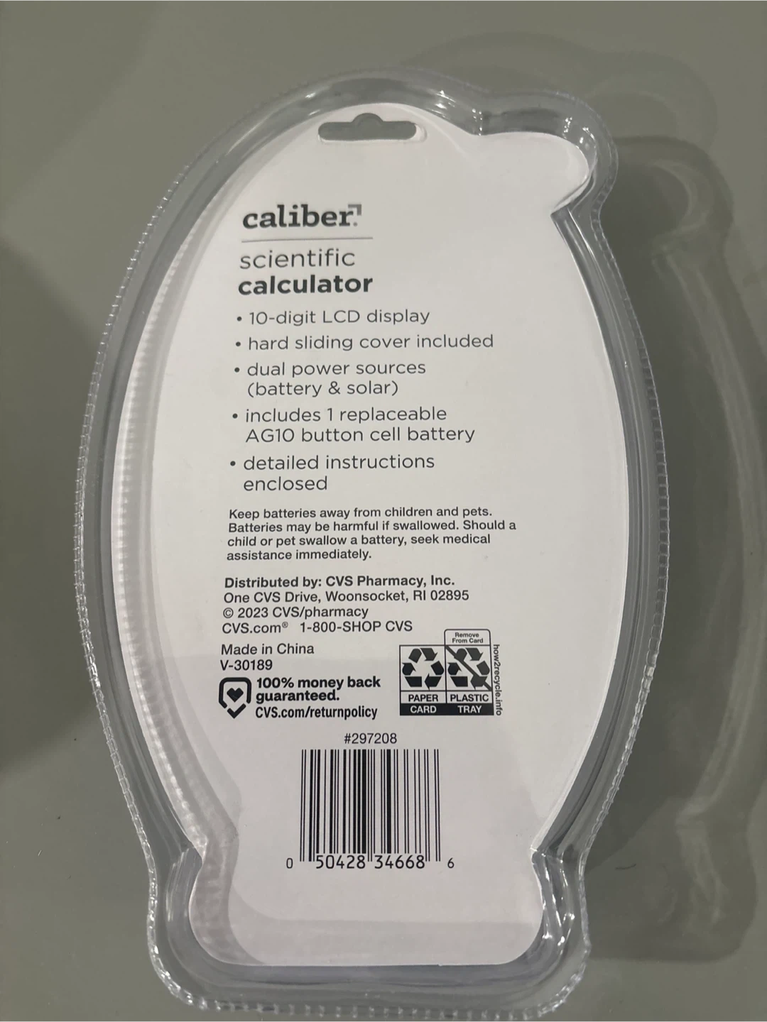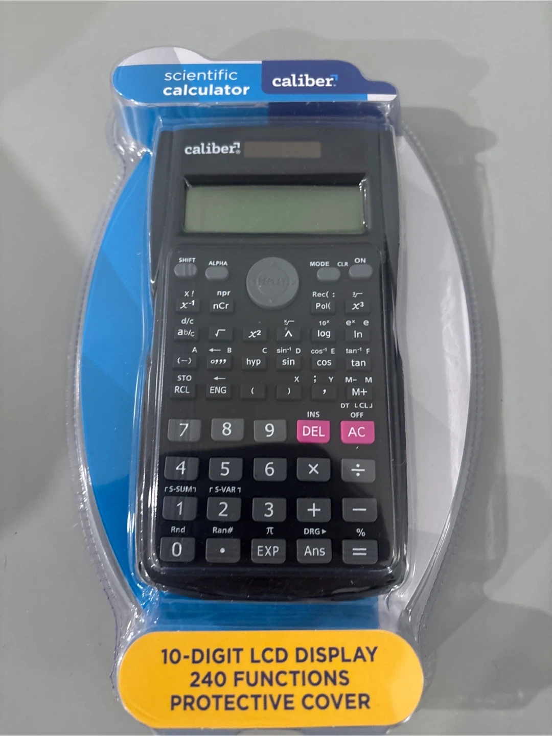 This Caliber scientific calculator features a 10-digit LCD display and 240 functions. It includes dual power sources (battery & solar) and a hard sliding cover. A replaceable AG10 button cell battery and detailed instructions are enclosed.
