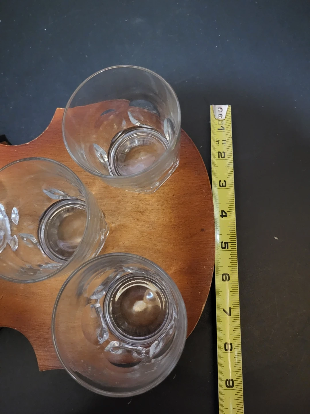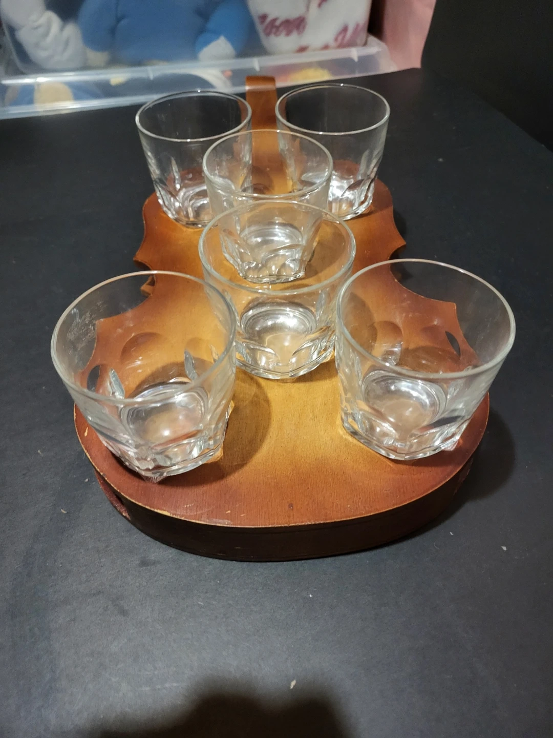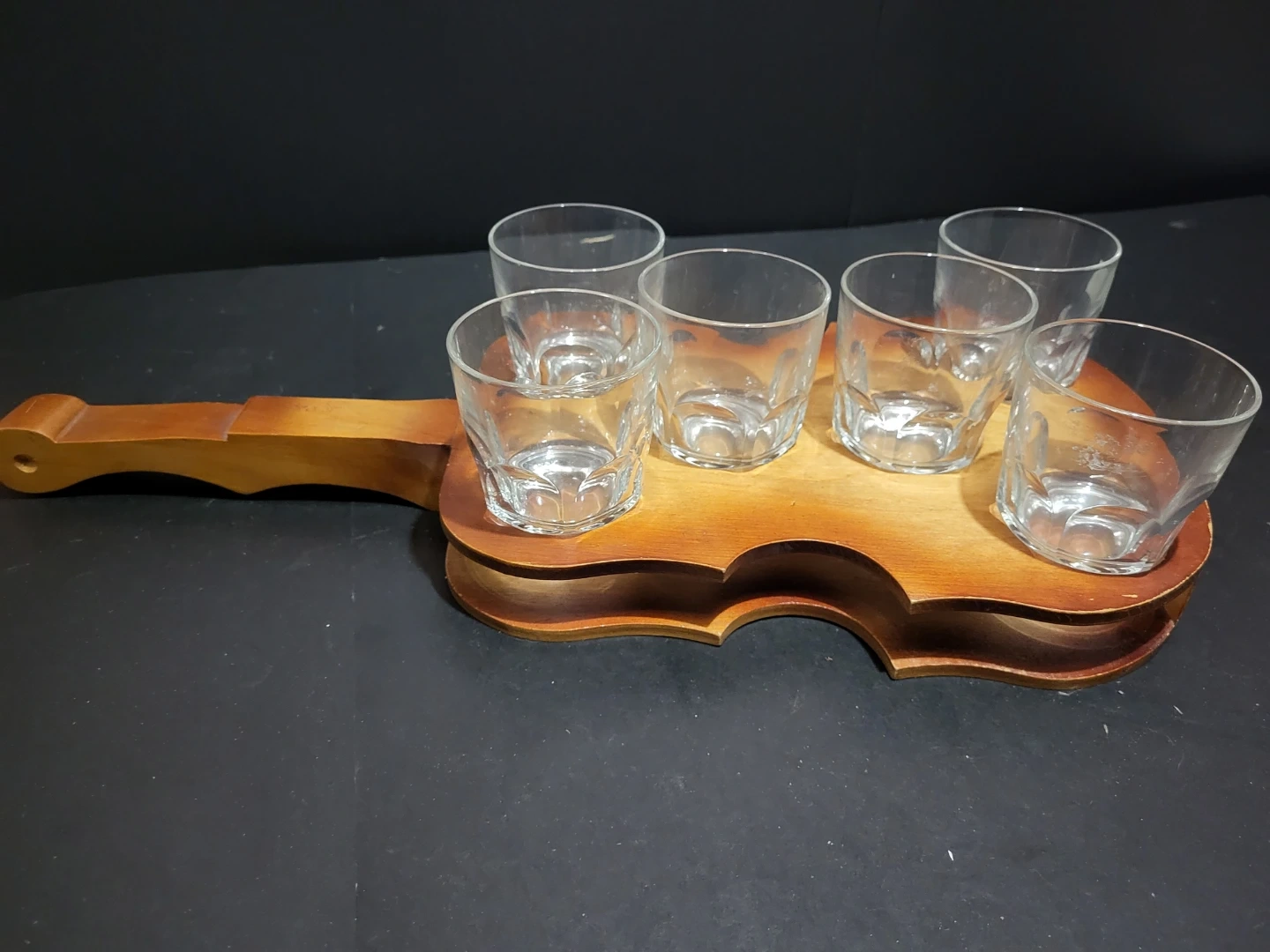 This unique set includes six clear glass glasses housed in a wooden holder shaped like a violin. It's a fun way to serve drinks at a party. The glasses are made of glass and the holder is wood.