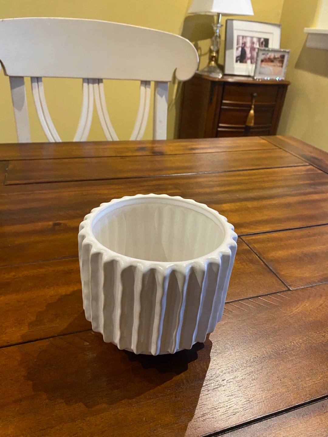 This white ceramic pot has a fluted exterior design. It's a versatile piece for holding small plants or as a decorative accent. It's suitable for tabletop or shelf display.