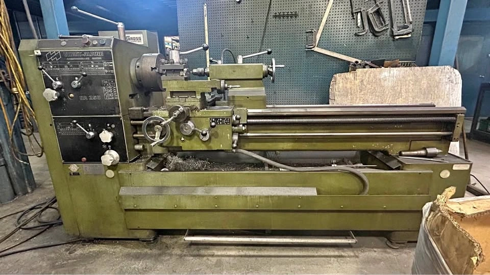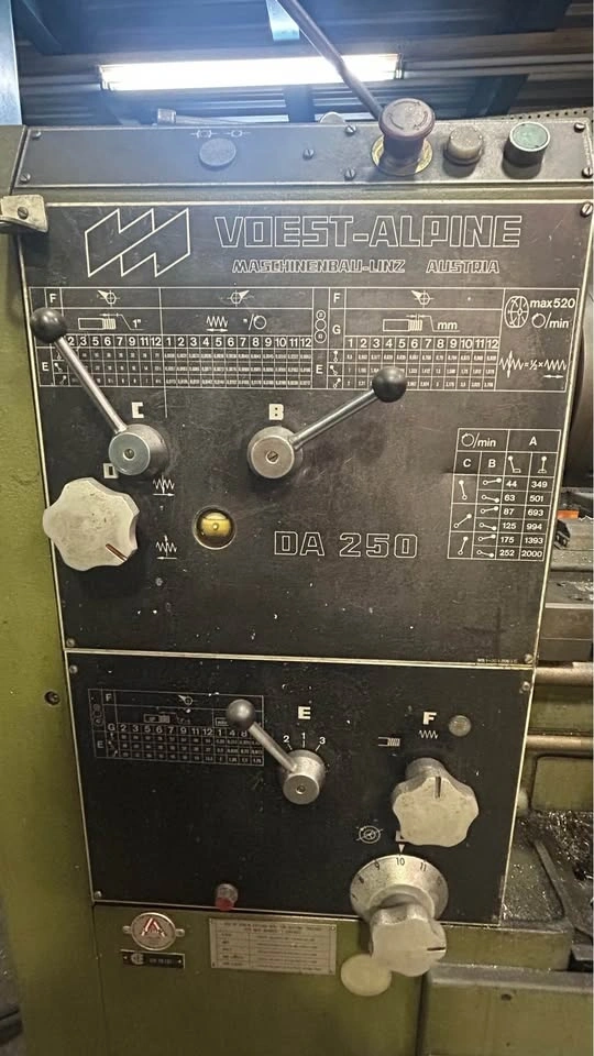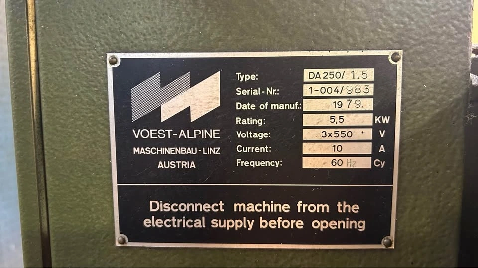 Selling a used Voest-Alpine DA 250 Lathe, manufactured in 1979. This is a robust machine tool perfect for various metalworking tasks. The lathe is equipped with a 5.5kW motor, operates at 3x550V, and 60Hz frequency. The item is showing signs of use, but still works.