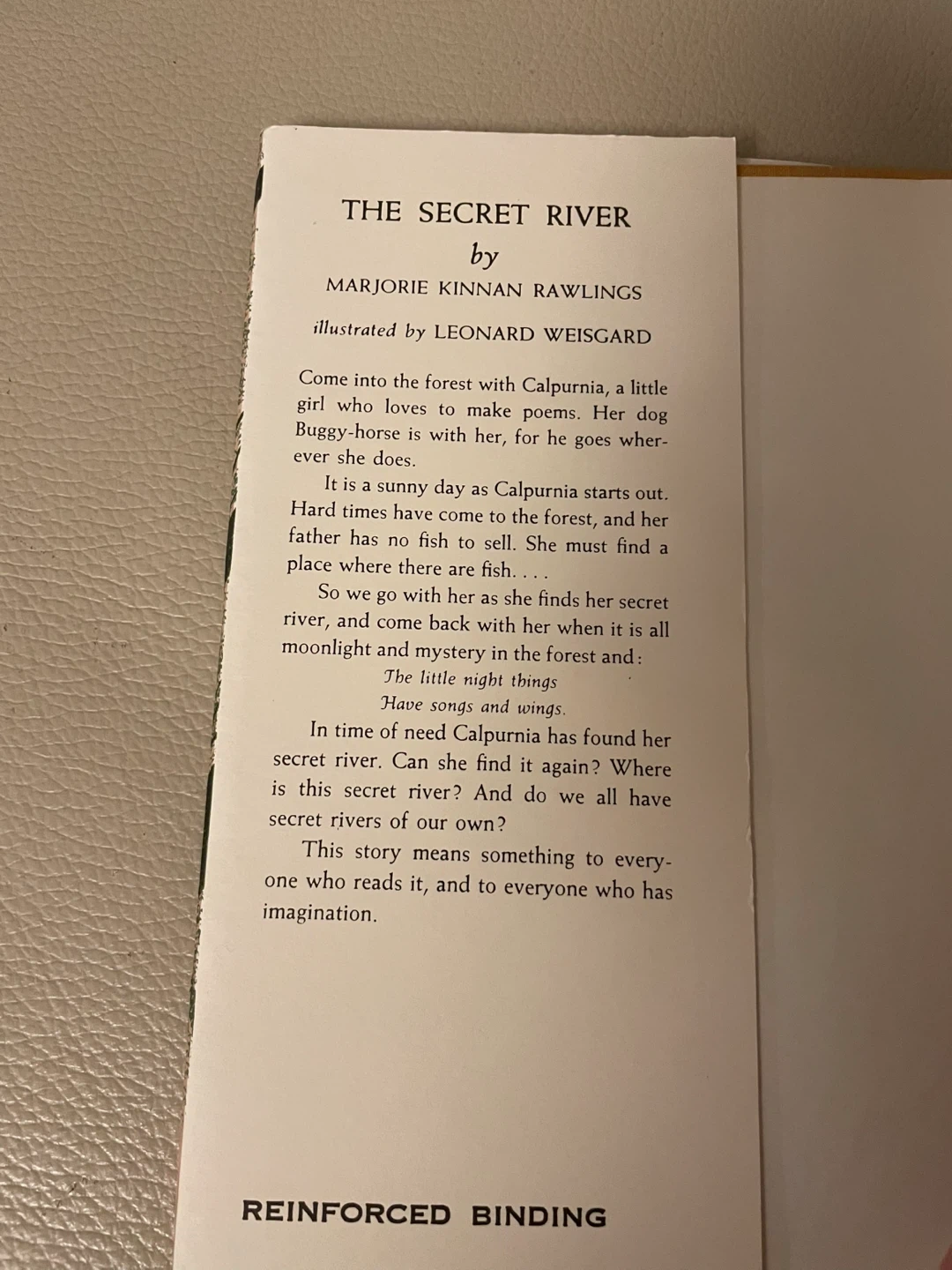 This is Marjorie Kinnan Rawlings' only story written directly for children. It's about a little girl named Calpurnia who finds a secret river in the forest. The story explores themes of imagination and childhood.