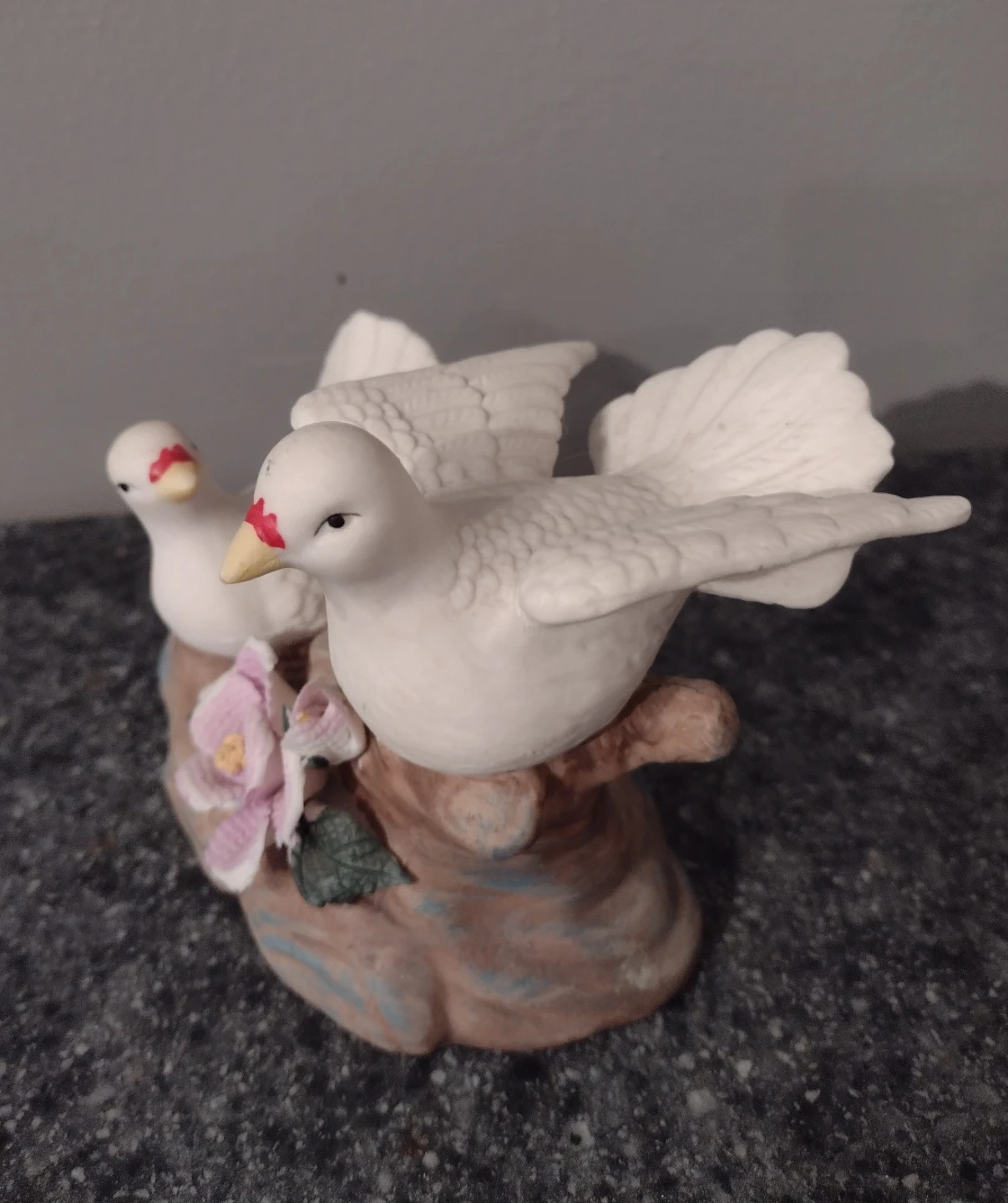 A lovely white ceramic figurine featuring two doves perched on a rustic base with a pink flower accent. This decorative piece adds a touch of elegance to any shelf or tabletop. Its classic design makes it a charming addition to home décor.