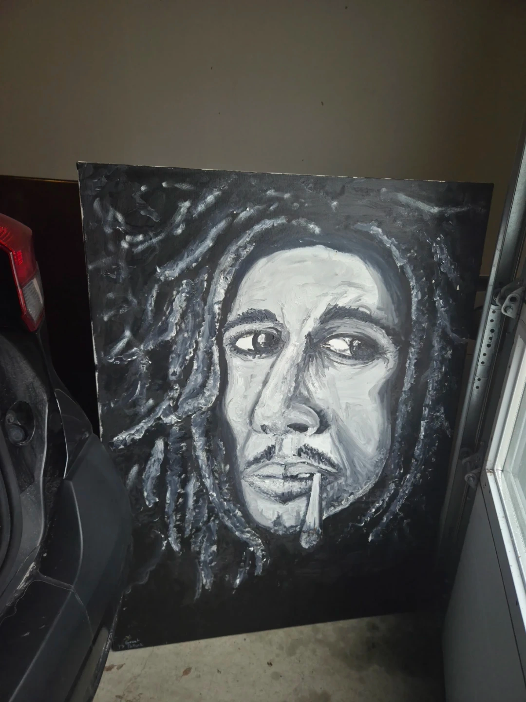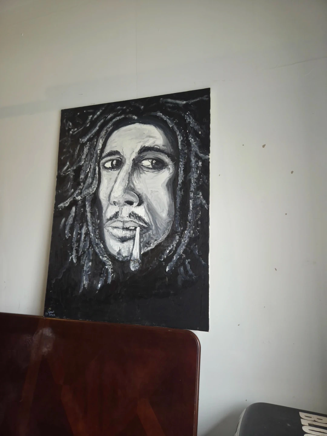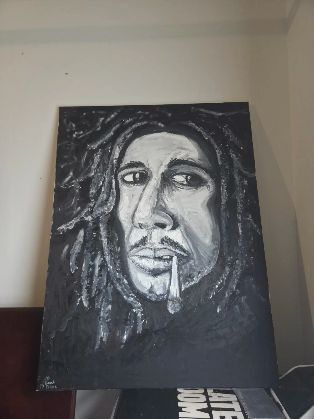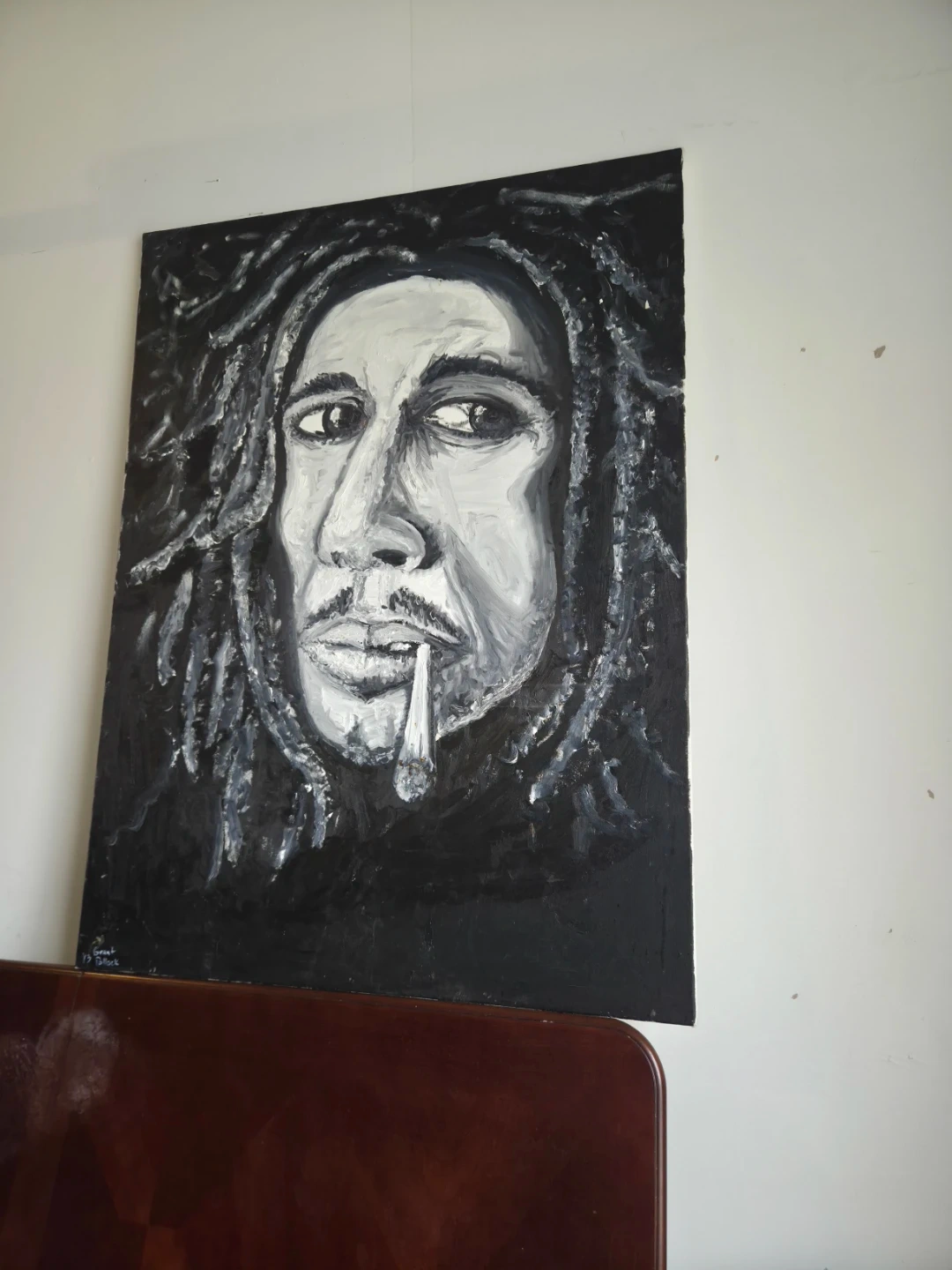 This is a unique, hand-painted portrait of Bob Marley in a striking black and white style. It's a large canvas piece, perfect for adding some character to your living space. The artwork captures his iconic look with expressive detail.