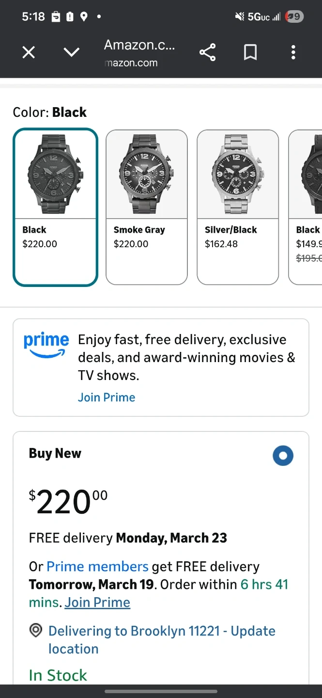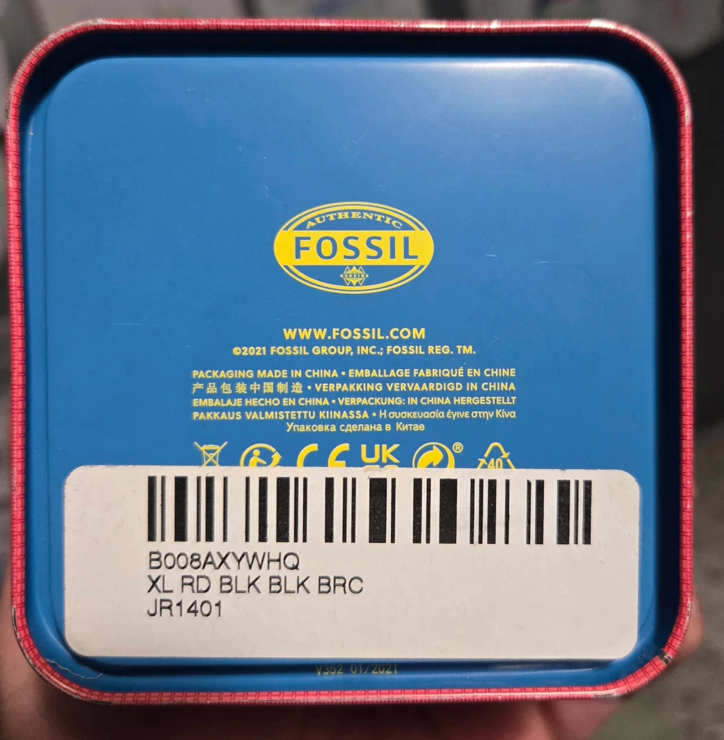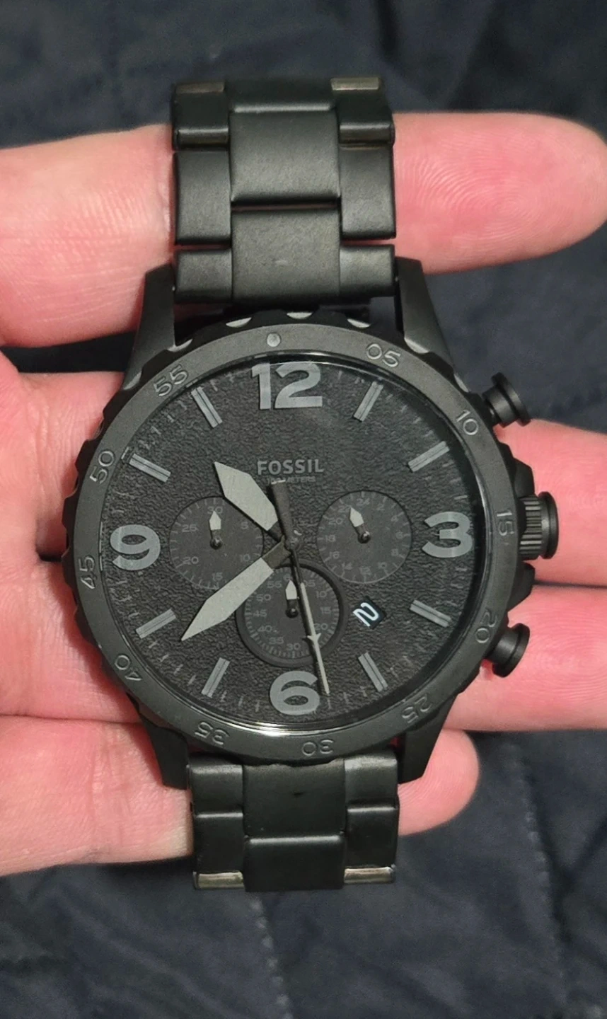 This black stainless steel Fossil chronograph watch features a detailed dial with multiple subdials. It's a stylish timepiece for everyday wear.
