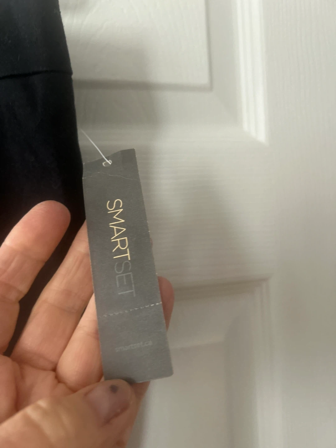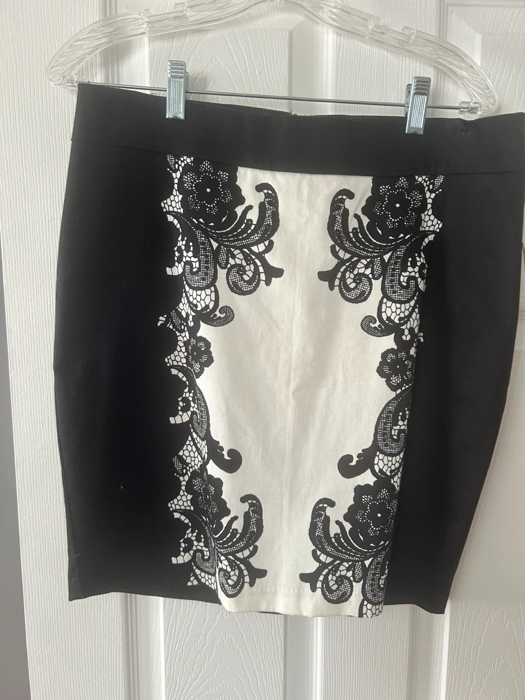This SMARTSET pencil skirt features a black stretch fabric with a striking white panel adorned with faux black lace detailing. The skirt has a back zipper closure. It's a size 10 with a classic pencil silhouette.