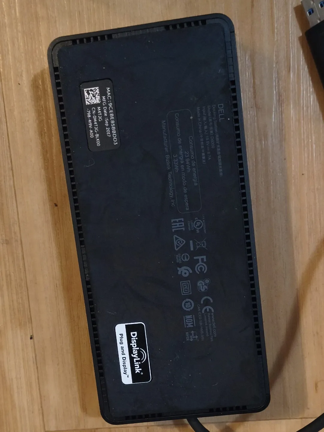 Dell D6000 universal docking station. Manufactured September 2017. Includes DisplayLink technology. 23.94Wh power consumption.