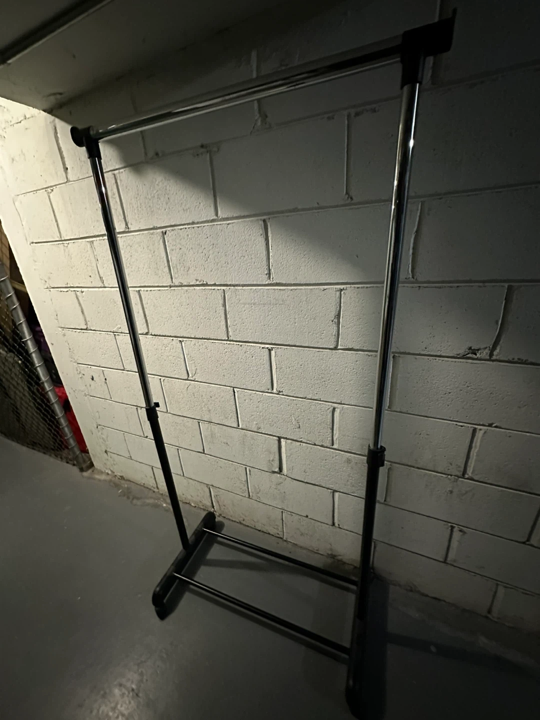This adjustable clothes rack is perfect for hanging garments. It's made of metal and features adjustable height. This rack offers a simple solution for organizing your closet or extra hanging space. Weighs almost nothing. It’s cheap but great for if you have people over and need an extra coat rack or for displaying clothes at a garage sale maybe. Cheap but will serve its purpose if taken care of. Adjusts to over 5 feet tall!