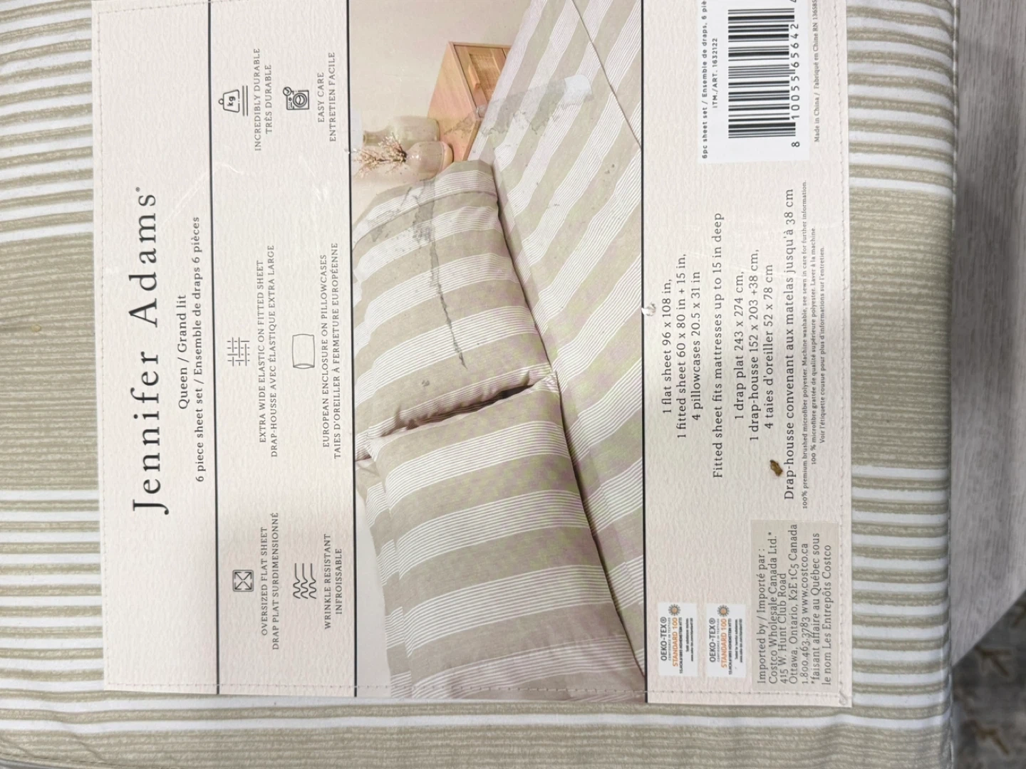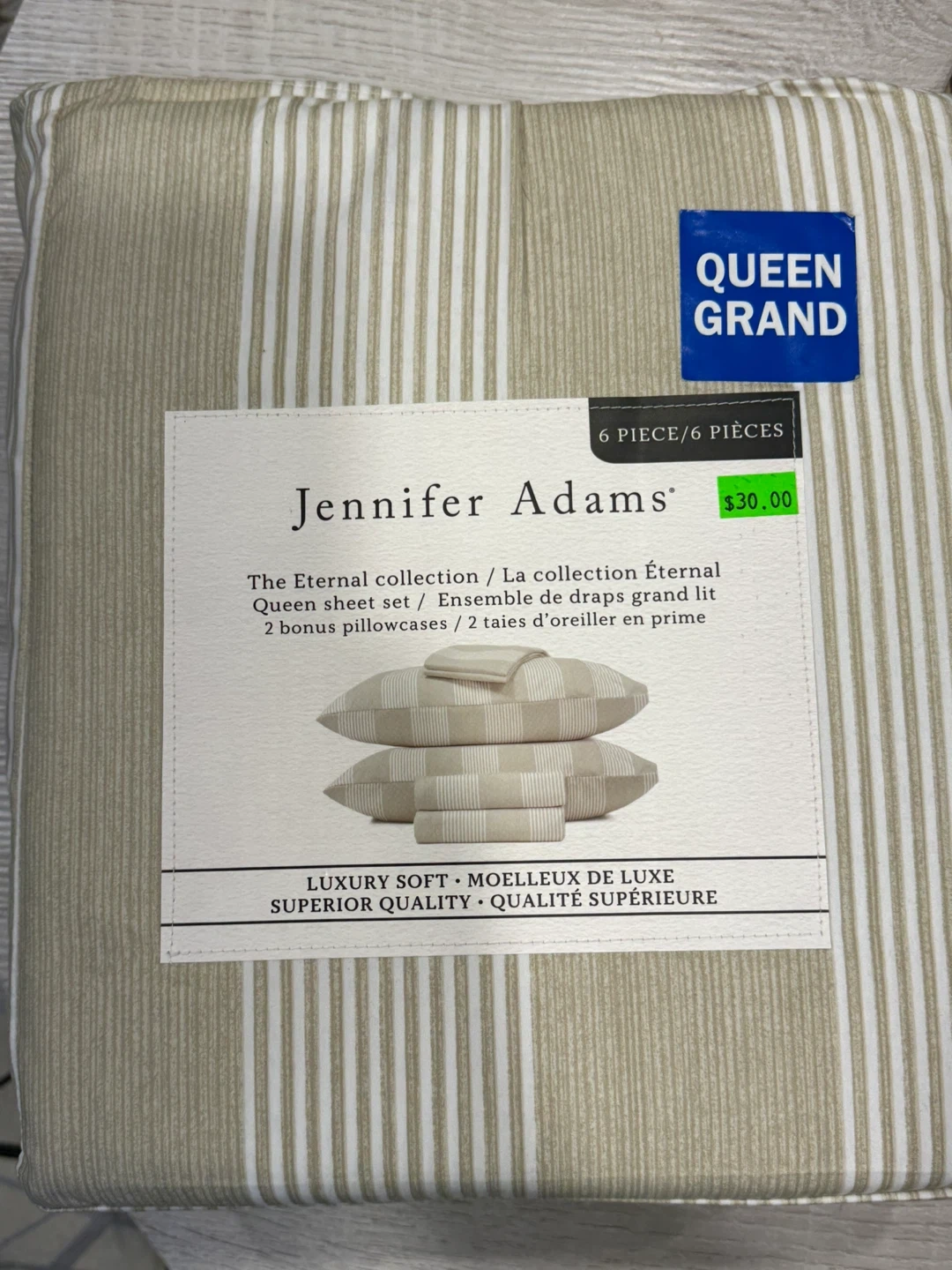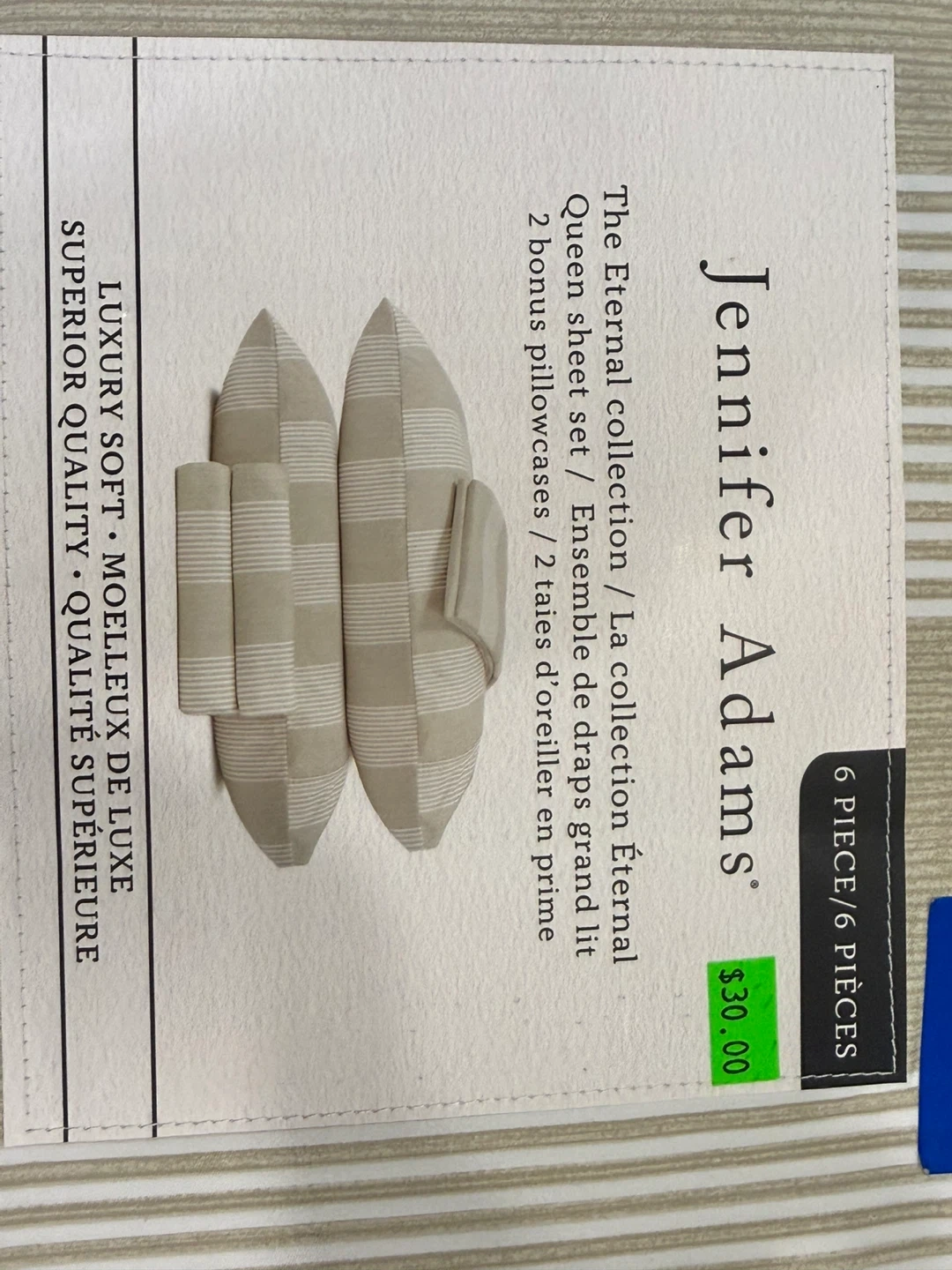 This Jennifer Adams sheet set includes 1 flat sheet (96 x 108 in.), 1 fitted sheet (60 x 80 in. + 15 in. deep), and 4 pillowcases (20.5 x 31 in.). It's made from 100% microfiber for superior softness. The fitted sheet accommodates mattresses up to 15 inches deep. This set is wrinkle-resistant and easy to care for. It's great for upgrading your bedroom comfort and style.