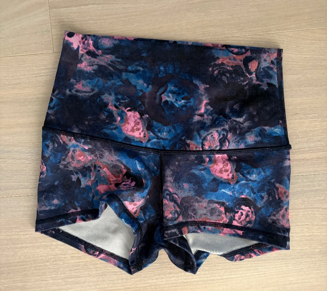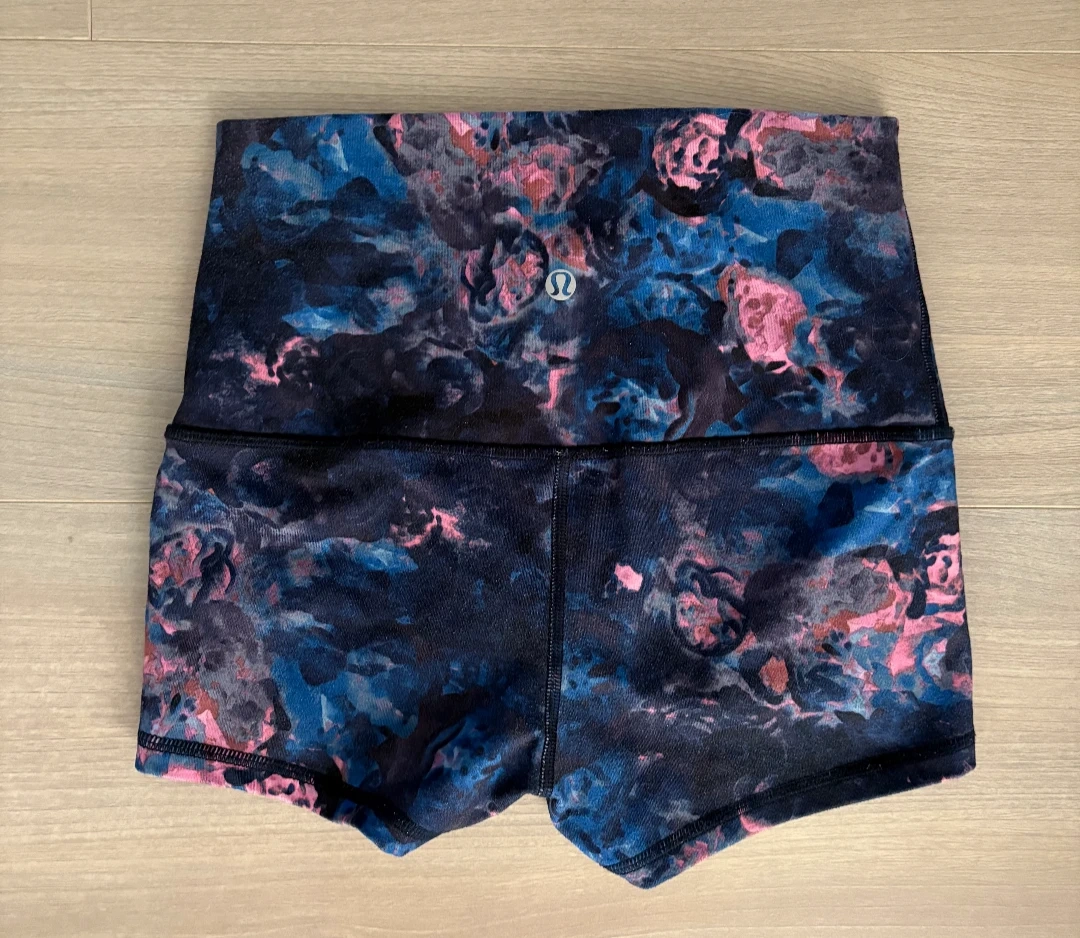 Lululemon Wunder Under Shorts with a blue & pink multicoloured pattern