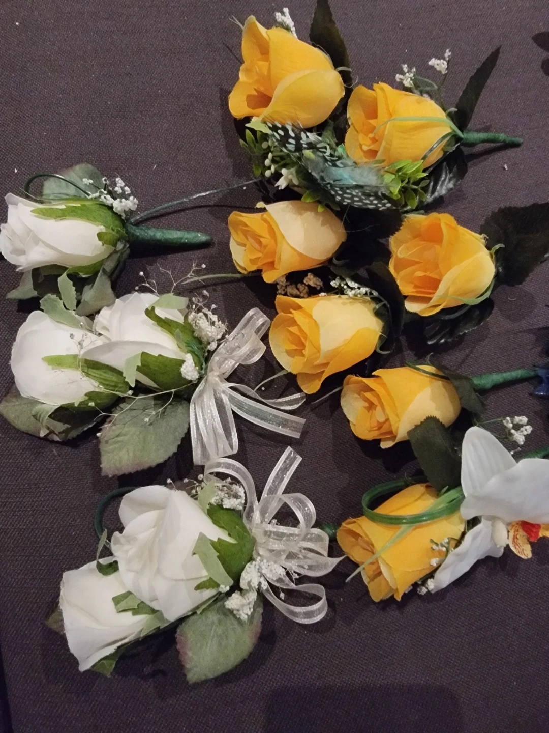 Set of artificial yellow and white roses with greenery and ribbons. Includes boutonnieres and corsages. Perfect for events like weddings or proms!
