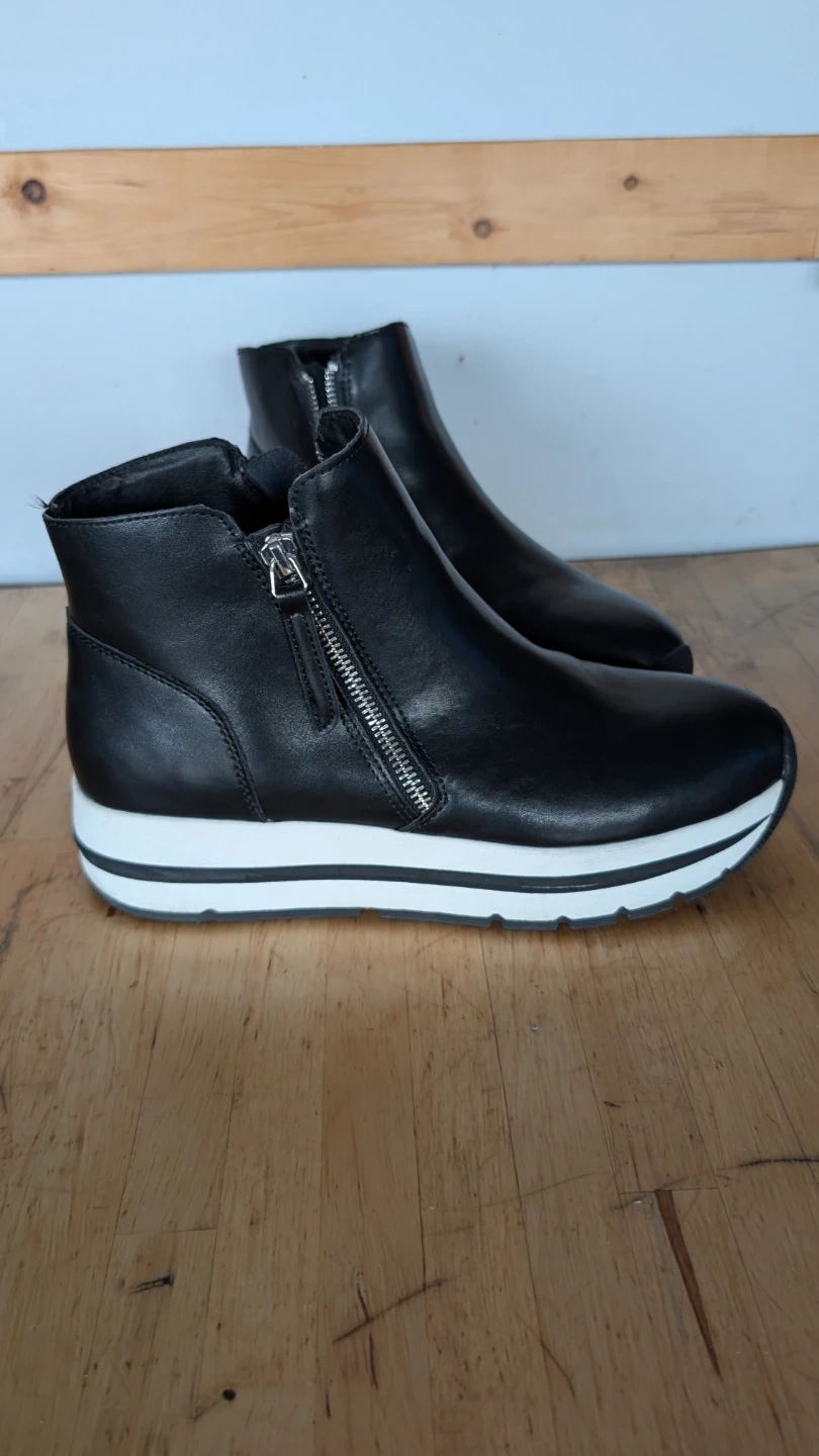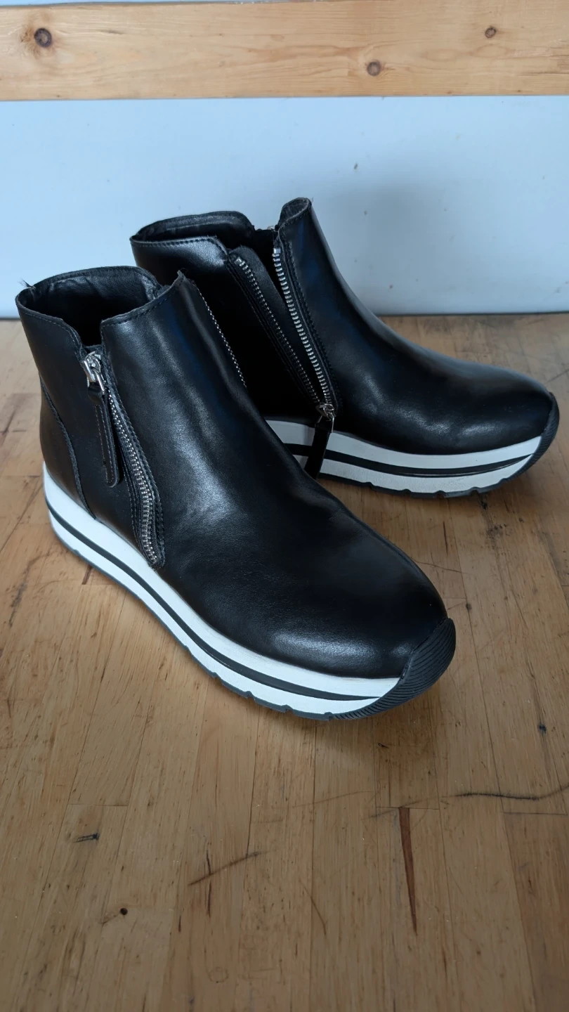 Steve Madden. Extremely well constructed leather uppers in blue black. The leather is a semi gloss finish. The sole is a solid, sturdy platform approx 2 inches made from a dense rubber that still provides for easy, comfortable movement.The rubber platform is layered with a black and white horizontal stripe and has a rubber cap detailing at the toe.The shoe has only been worn once on the runway, they're practically new except for one wear. They are a medium width. The leather bootie cradles the foot comfortably. Size 8.5. True to size.
