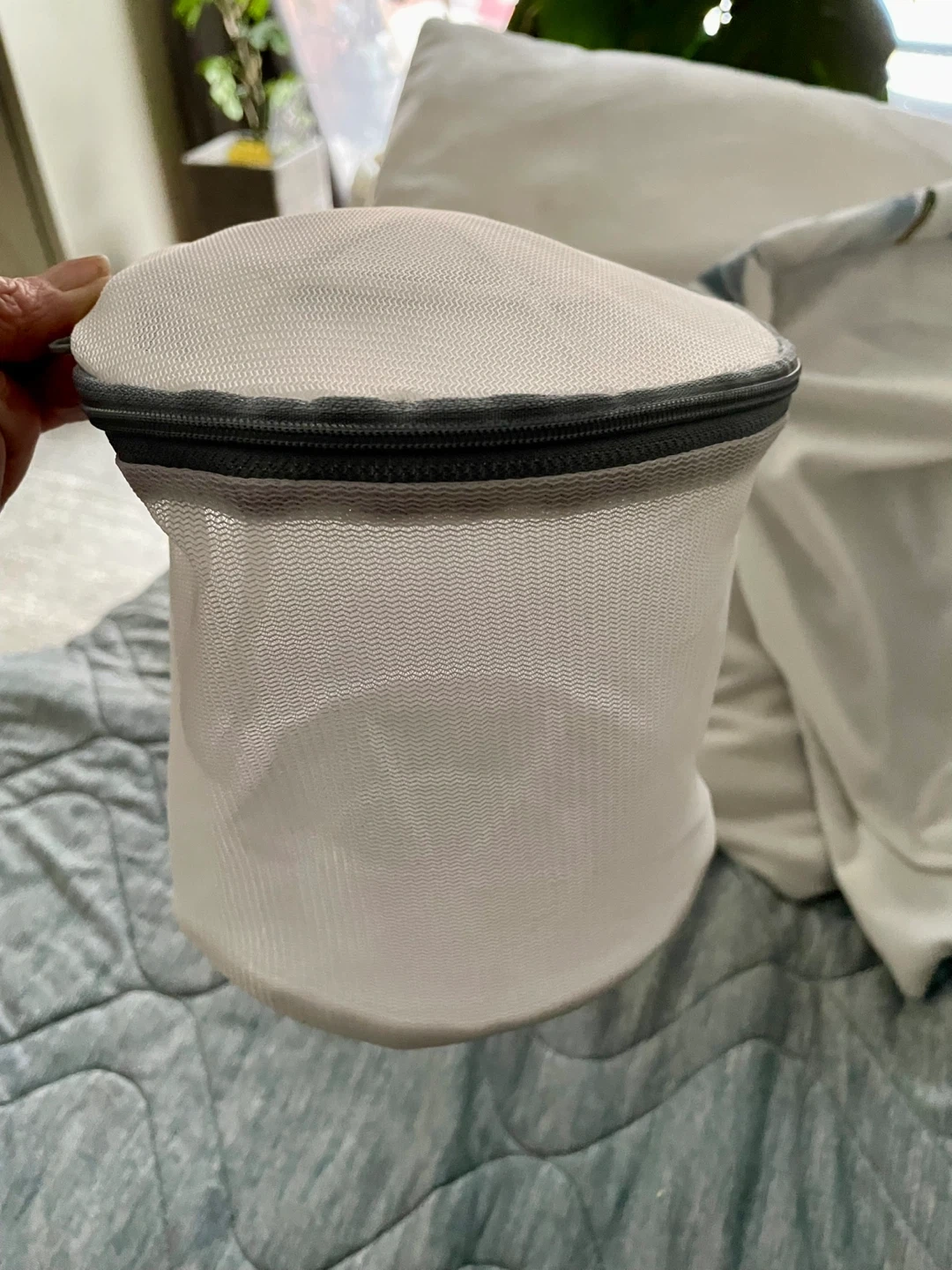 This mesh laundry bag is designed to protect delicate clothing and small items during washing. It's made of fine mesh and features a zippered closure to keep contents secure. Great for bras, socks, and other small garments.