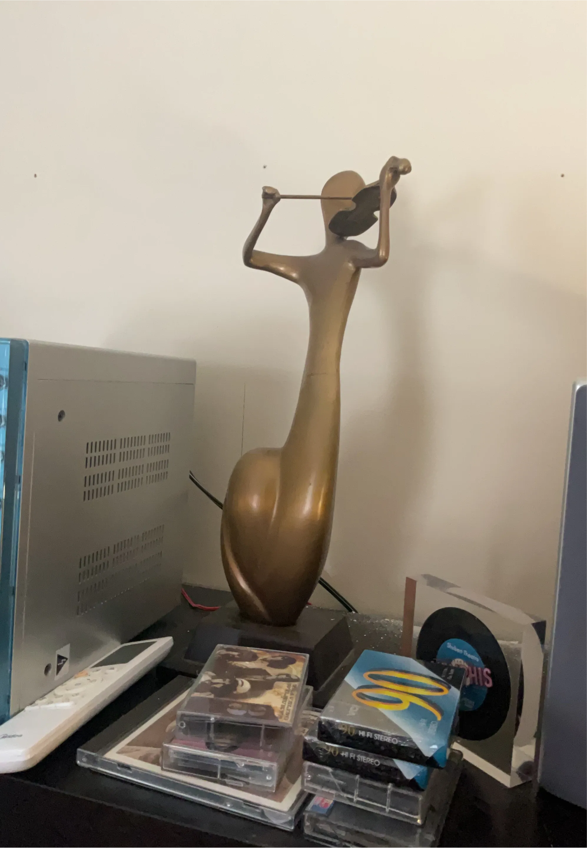 This is a striking brass sculpture depicting a person playing the violin. It's made of metal and has a sleek, modern design. This piece would make a great addition to any music lover's collection!