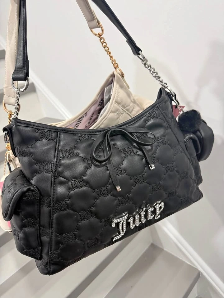 Juicy Couture Black Quilted Shoulder Bag Rhinestone Logo Pom-Pom